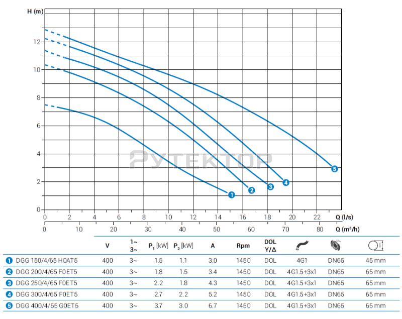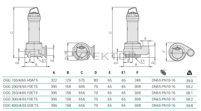 Насосные агрегаты типа DGG - погружные с глубоко посаженным рабочим колесом Vortex и горизонтальным подающим патрубком. Проточная часть насоса и рабочее колесо выполнены из чугуна. Два оппозитные механические уплотнения из карбида кремния в осматриваемой масляной камере. Электродвигатель сухого типа. Назначение: для загрязненной и канализационной воды с длинными волокнистыми и взвешенными частицами диаметром до 65 мм температурой не более 40° С; предназначен для использования в очистных сооружениях, канализационных системах, в промышленности и сельском хозяйстве.