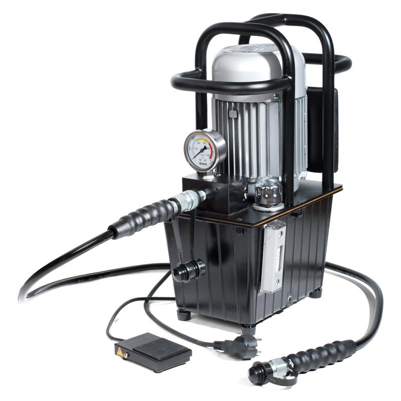 Назначение, применение: Создание давления рабочей жидкости при работе с исполняющим гидравлическим инструментом. В стенку маслобака встроен термометр и индикатор уровня маcла в помпе. Протекторы мотора выполняют функцию рукояток для переноски.