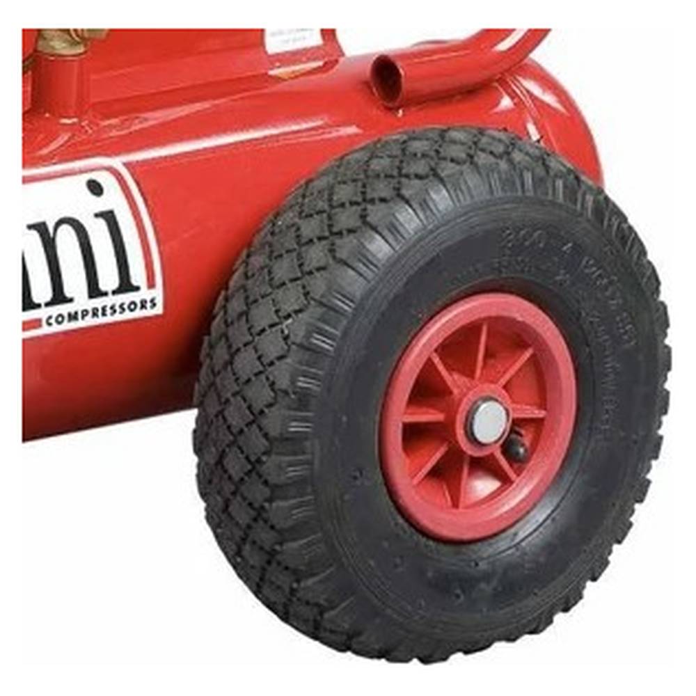 Конструкция смонтирована на мощной трубчатой металлической раме с защитной крышкой, надёжно предохраняющей внутренние компоненты. Для удобства перемещения предусмотрены прочные колёса большого диаметра и эргономичная ручка. Противоскользящие опорные элементы исключают самопроизвольное смещение компрессора во время работы.