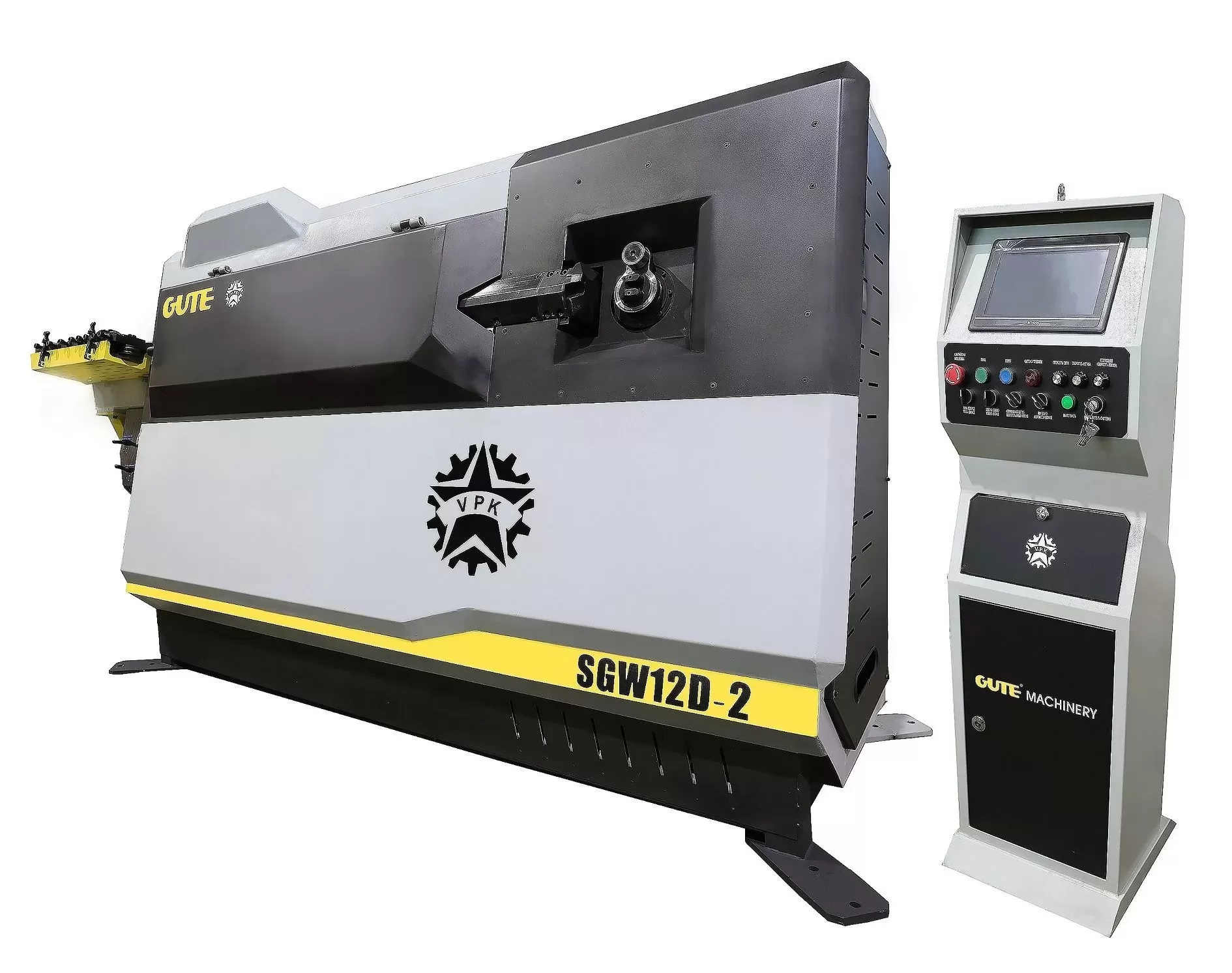 Правильно-гибочный станок с ЧПУ для работы с арматурной сталью. Обрабатывает арматуру диаметром до 12 мм. Максимальная скорость протяжки 75-100 м/мин. Мощность 31 кВт.