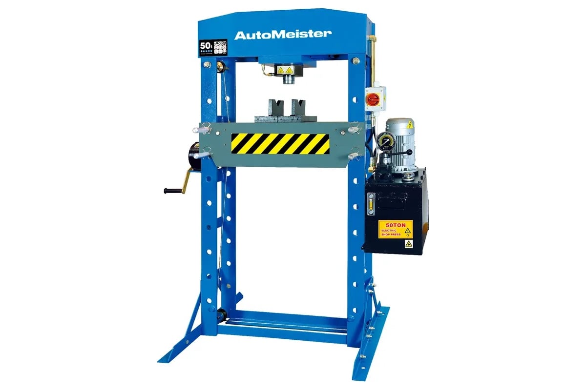 Пресс электрогидравлический AutoMeister 50т T0981H - профессиональный напольный пресс с перемещаемым цилиндром вправо-влево. Усилие составляет 50 тонн. Управление силовой подачей штока цилиндра осуществляется электроуправлением. Пресс оснащен сварной станиной. Рабочие параметры: 380 В, мощность — 1.5 кВт.