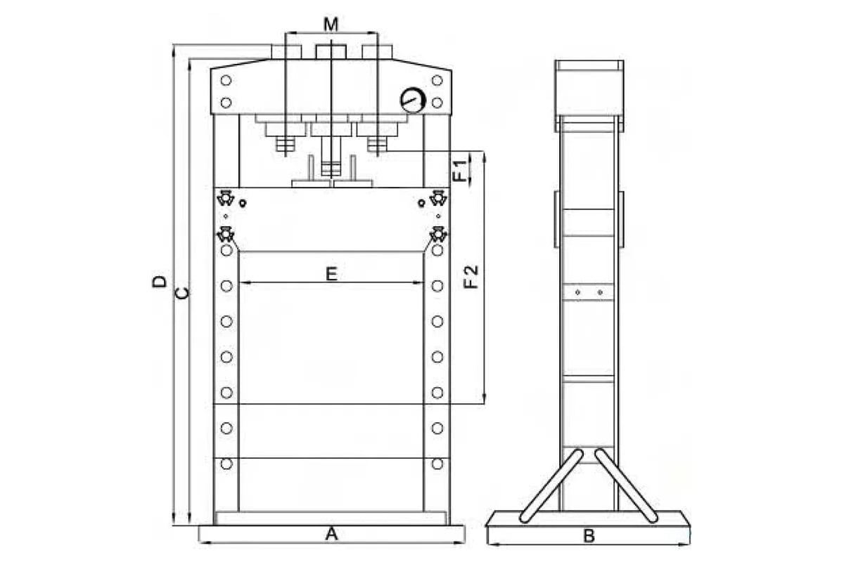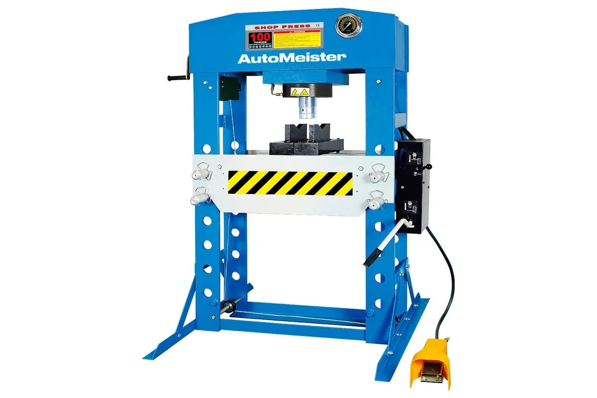 Пресс пневмогидравлический AutoMeister 100т T0913CEH - профессиональный напольный пресс с подвижным цилиндром вправо-влево. Усилие составляет 100 тонн. Управление силовой передачей штока цилиндра осуществляется вручную и пневматически (с помощью ножной педали). Пресс оснащен сварной станиной. Рабочее давление воздуха — от 7,5 до 8,5 бар.
