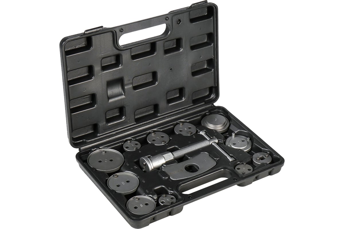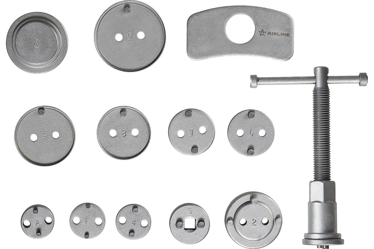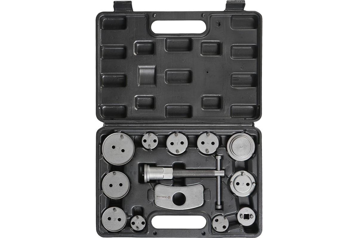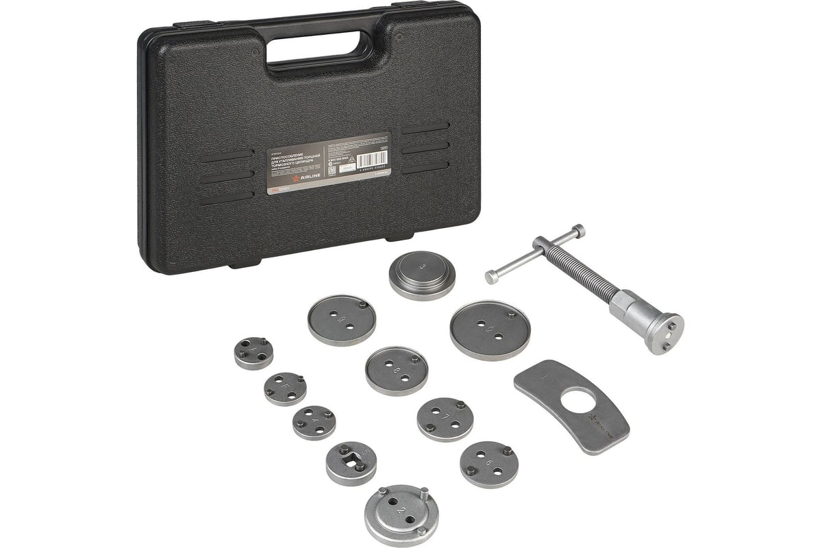Приспособление для утапливания поршней тормозного цилиндра, набор 13пр., кейс AIRLINE ATBT003 Приспособление для утапливания поршней тормозного цилиндра, набор 13пр. предназначен для обслуживания и замены тормозных колодок в дисковых тормозных системах автомобилей. Позволяет быстро и безопасно утопить поршень суппорта, исключая повреждение деталей и облегчая процесс монтажа новых колодок.