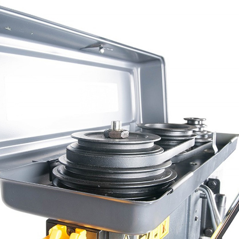 Станок обладает рядом особенностей. Он работает от обычной бытовой сети 230 В и для ввода в эксплуатацию, подлежит напольной стационарной установке. 12 скоростной ременный привод с промежуточным шкивом способствует снижению шума при работе. Мощный асинхронный двигатель выдерживает высокие нагрузки.