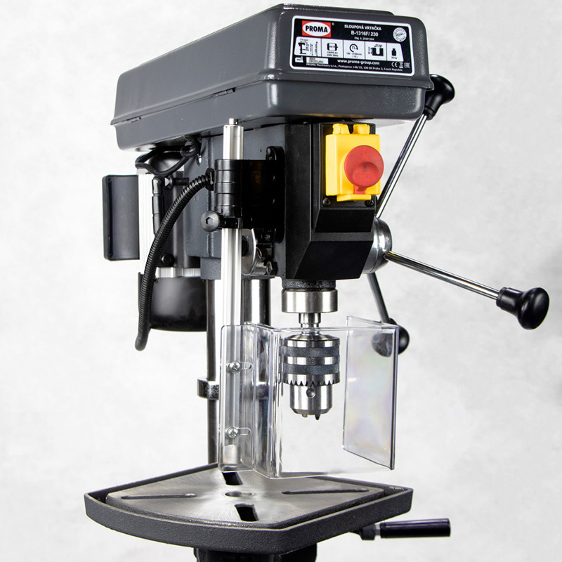 B-1316F/230оснащён функциями поворота, подъёма и наклона стола, а также поворота шпиндельной головки на колонне. Это обеспечивает удобство работы и расширяет возможности станка.