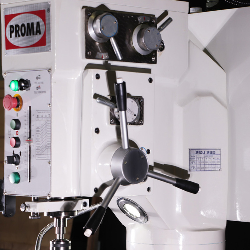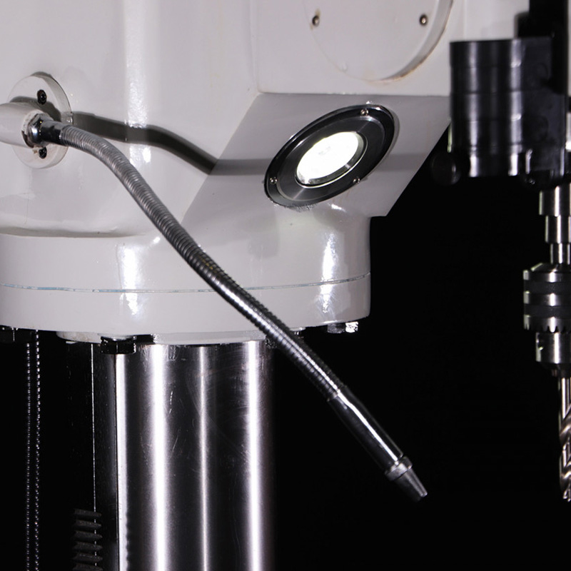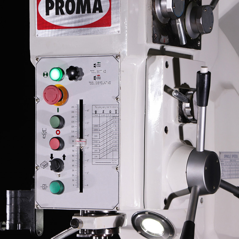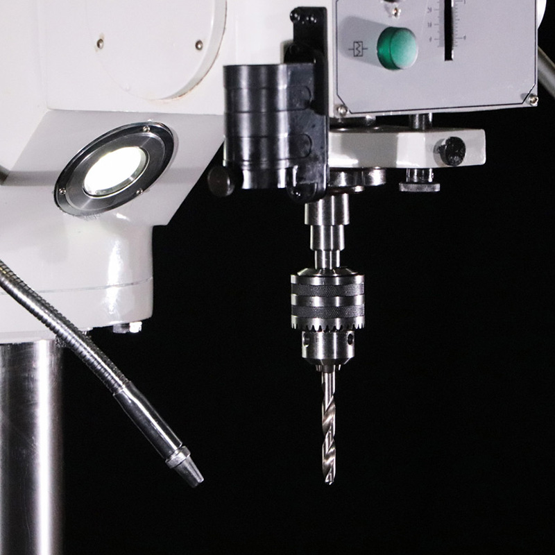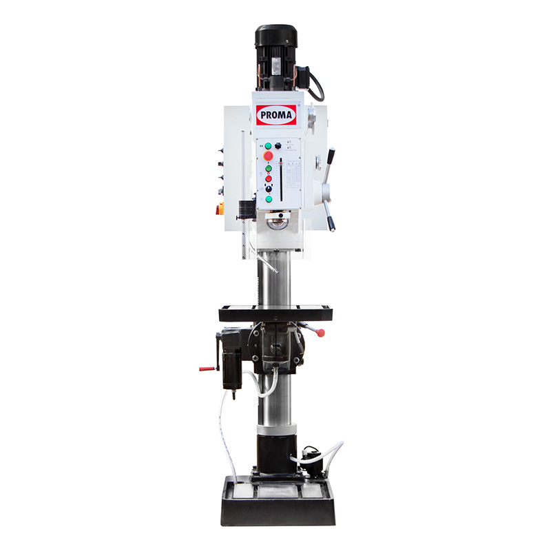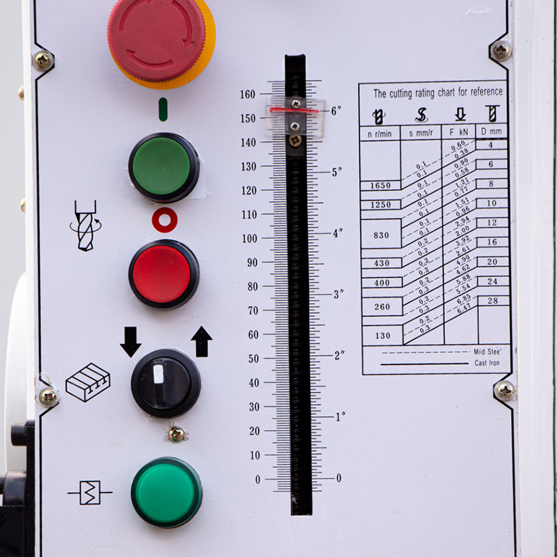 Станок обладает рядом особенностей. Данная модель произведена в напольном исполнении и требует надёжной установки на анкерные болты. Отдельно стоить отметить регулируемую автоматическую вертикальную подачу пиноли при сверлении с автоматическим отключением на заданную глубину. 12 скоростной редукторный привод с удобным переключением оборотов шпинделя. Мощный асинхронный двигатель выдерживающий высокие нагрузки. Автореверс при нарезании резьбы, причём так же как автоподача – с настройкой заданной глубины.