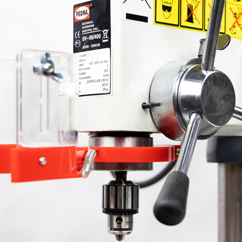 BV-06/400 оснащён функцией поворота шпиндельной головки на колонне. Это обеспечивает удобство работы и расширяет возможности станка. В основании, которое одновременно является рабочим столом, имеется т-образный паз для крепления детали, приспособления или станочных тисков.