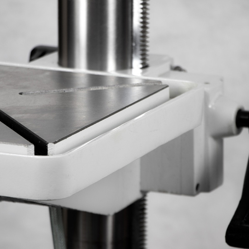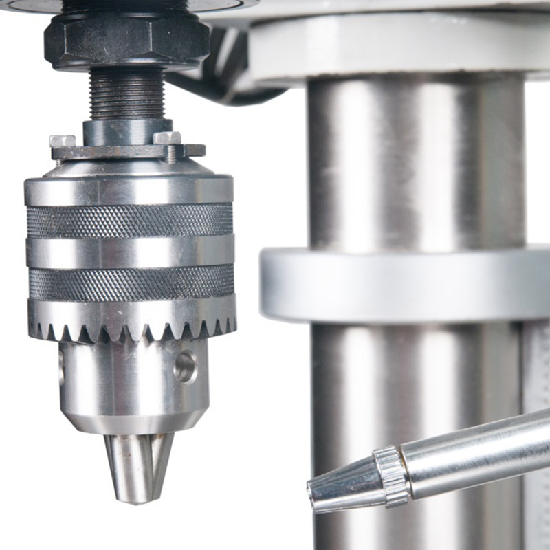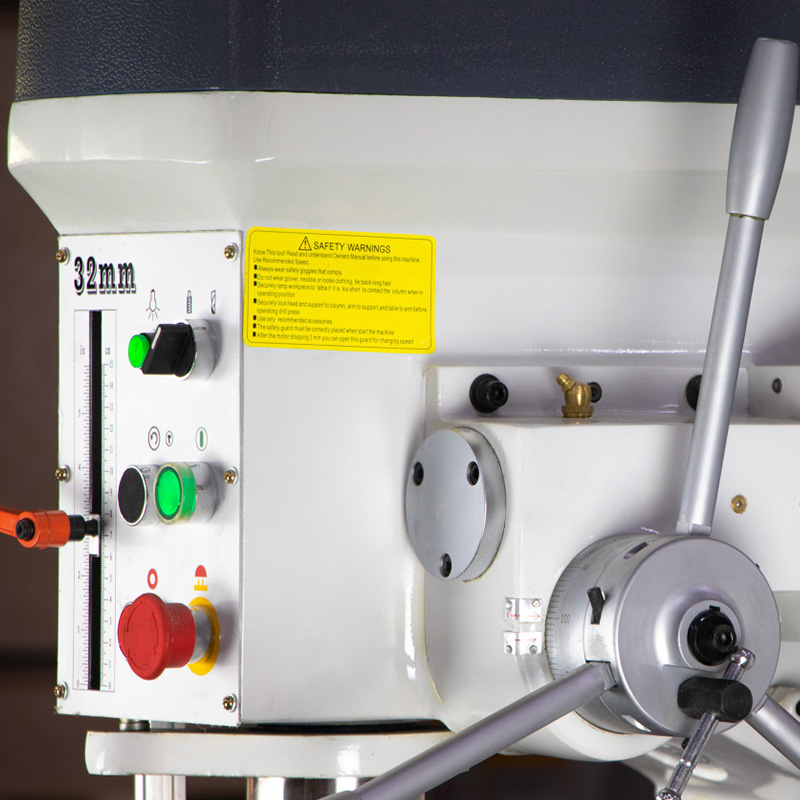 Станок обладает рядом особенностей. Данная модель произведена в напольном исполнении и требует надёжной установки на анкерные болты. Отдельно стоить отметить регулируемую автоматическую вертикальную подачу пиноли при сверлении с автоматическим отключением на заданную глубину. 8 скоростной ременный привод с промежуточным шкивом для снижения шума при работе и защитой от проскальзывания. Мощный асинхронный двигатель выдерживающий высокие нагрузки. Автореверс при нарезании резьбы, причём так же как автоподача – с настройкой заданной глубины.