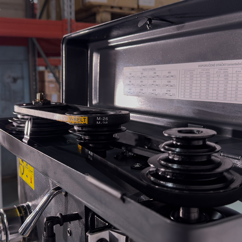 Станок обладает рядом особенностей. 12 скоростной ременный привод с промежуточным шкивом для снижения шума при работе. Мощный асинхронный двигатель выдерживающий высокие нагрузки. Реверс для нарезания резьбы или работы инструментом с левым направлением режущих кромок.