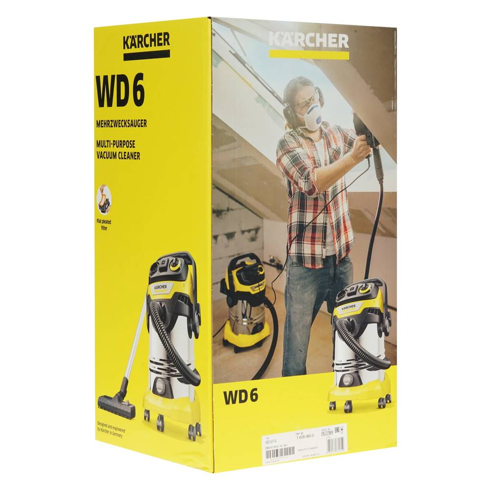 Пылесос Karcher WD 6 P S V-30/6/22/T (YSY) *EU для уборки сухих и влажных загрязнений. Оснащён баком из нержавеющей стали объёмом 30 литров, всасывающим шлангом длиной 2.2 метра, кабелем длиной 6 метров, а также плоским складчатым фильтром, который установлен в кассете для быстрого извлечения без контакта с мусором. В комплектацию пылесоса входят эргономичные принадлежности, а в его корпусе предусмотрены отверстия для их хранения.