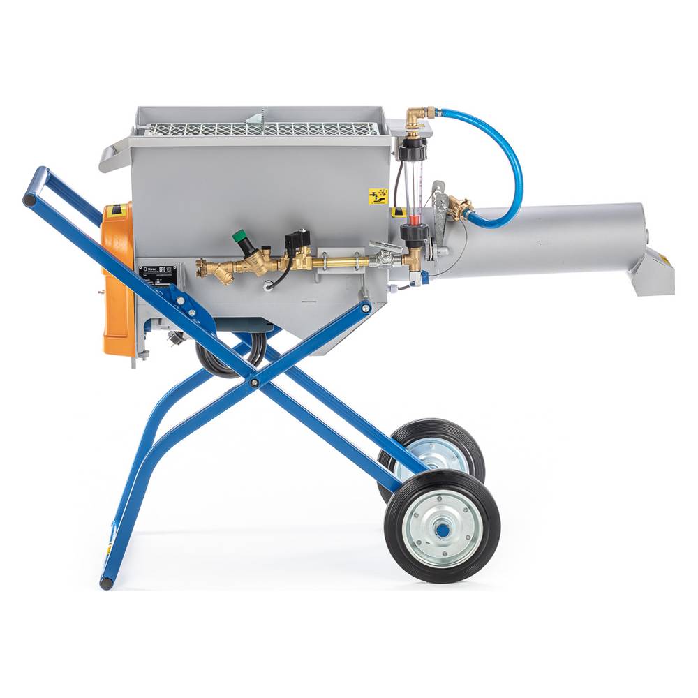 Модель отличается удобством эксплуатации: складная рама и прорезиненные колёса позволяют легко перемещать агрегат по стройплощадке и транспортировать между объектами. Встроенная водная арматура с фильтром тонкой очистки автоматически поддерживает нужное соотношение воды и сухой смеси, обеспечивая однородную консистенцию раствора. Надёжная муфта привода снижает нагрузку на мотор, а специальный материал опорного подшипника увеличивает срок службы оборудования.
