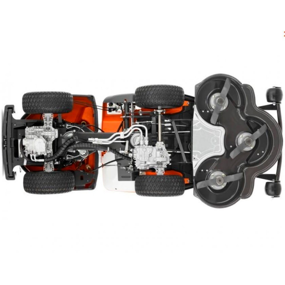 Мощный, самоходный, полноприводный райдер (газонокосилка с сиденьем) для кошения и сбора травы в специальный травосборник (300 л). Расположенная спереди режущая дека обеспечивает высочайшее качество кошения травы, обзор местности, контроль за процессом и досягаемость обработки труднодоступных участков. Режущая дека приобретается отдельно, как аксессуар. Система крепления позволяет оперативно и без усилий установить режущую деку в сервисное положение (под углом 90 градусов к газону), что облегчает сервисное обслуживание. Шарнирное соединение рамы (поворачивают задние колёса), система полного привода и гидроусилитель руля обеспечивают маневренность и устойчивое положение машины даже на склонах и мокрой траве. Уникальная система доставки травы от деки в травосборник (шнек) предотвращает засор прохода биомассой. Подъём и опорожнение травосборника осуществляется автоматически, электрической системой, блок управления которой расположен на приборной панели в непосредственной близости от руки оператора.