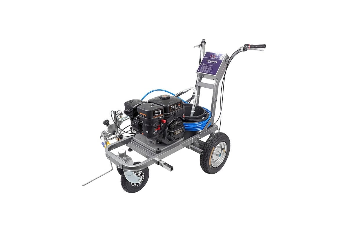 Разметочная машина на один пистолет с поршневым насосом. Работает от бензинового двигателя, краска наносится на поверхность через направленный пистолет. Разметочная машина не имеет привода, движение происходит за счет движения оператора, т.е. толкая машину и нажимая рычаги на рукоятках машины. Есть возможность наносить прямые горизонтальные и прерывистые линии.