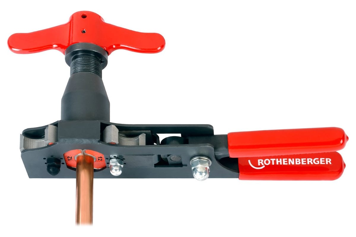Развальцовщик Rothenberger Roflare Revolver - развальцовка с матрицами револьверного типа для создания точных бортиков под углом 45° градусов на медных трубах диаметром от 6 до 18 мм (1/4, 5/16, 3/8, _, 5/8, _”). Компактная конструкция позволяет работать одной рукой в труднодоступных местах при монтаже систем кондиционирования и холодильного оборудования. Развальцовщик оборудован автоматическим упором и системой быстрого зажима, что обеспечивает отличное позиционирование трубы на развальцовочном контуре.