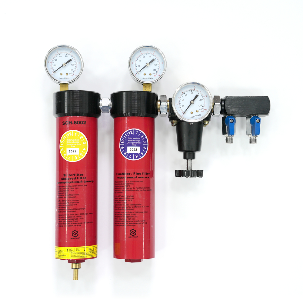 Состоит: 2 фильтрующих элемента, 2 манометра, регулятор давления.