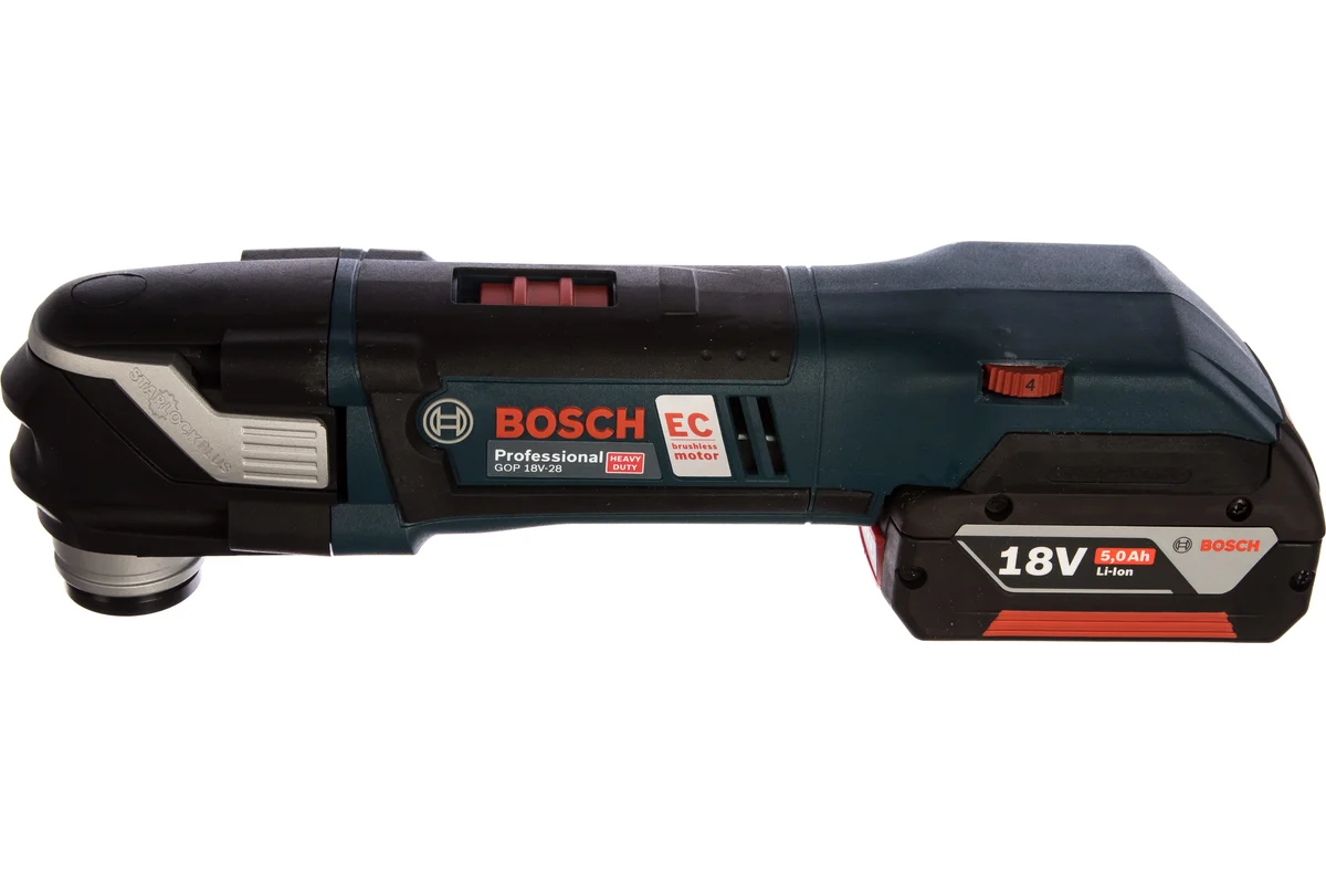 Аккумуляторный универсальный резак Bosch GOP 18V-28 0.601.8B6.003 снабжен бесщеточным двигателем, что говорит о его надежности и долговечности. Двухпозиционная пусковая клавиша исключает необходимость постоянно держать на ней палец. Количество колебаний шпинделя варьируется в диапазоне от 8000 до 20000 в минуту, что позволяет максимально точно подстроиться под конкретный тип работы и материал. В комплект входит большой набор оснастки, что расширяет сферу применения инструмента.