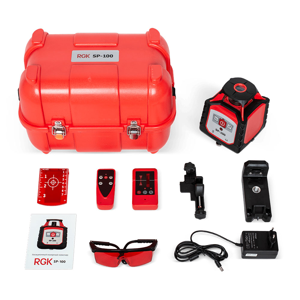 Ротационный нивелир RGK SP-100 для монтажных работ и нивелирования как в закрытых пространствах, так и на строительной площадке. Прибор обеспечивает проекцию замкнутой плоскости с точностью ±1,5 мм на 10 м. Прибор позволяет регулировать количество оборотов лазерной головки в пределах 120, 300 или 600 об./мин., обеспечивая непрерывную и чёткую плоскость на любом расстоянии в пределах 200 м (с приемником) от устройства. Также RGK SP-100 может проецировать неподвижную лазерную точку, что в сочетании с оптическим отвесом позволяет осуществлять базовые работы по выносу точек.