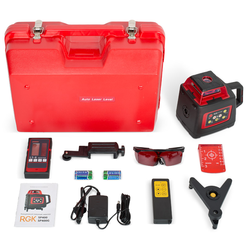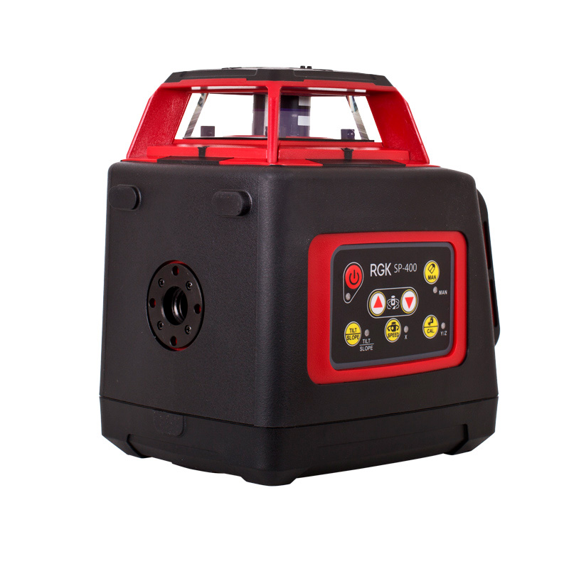 Ротационный нивелир RGK SP-400 предназначен для работы с приёмником на расстоянии до 200 метров. Точность горизонтальной плоскости ±1 мм на 10 м, а вертикальной — ±1,5 мм на 10 м. Выравнивание выполняется с помощью сервоприводов в диапазоне ±5°. При выходе за пределы автовыравнивания лазер остановит вращение и отключится. Режим сканирования позволяет проецировать сектор с углом 10°, 30° или 60° с одной из двух скоростей, а при остановке фиксирует точку в центре сектора.