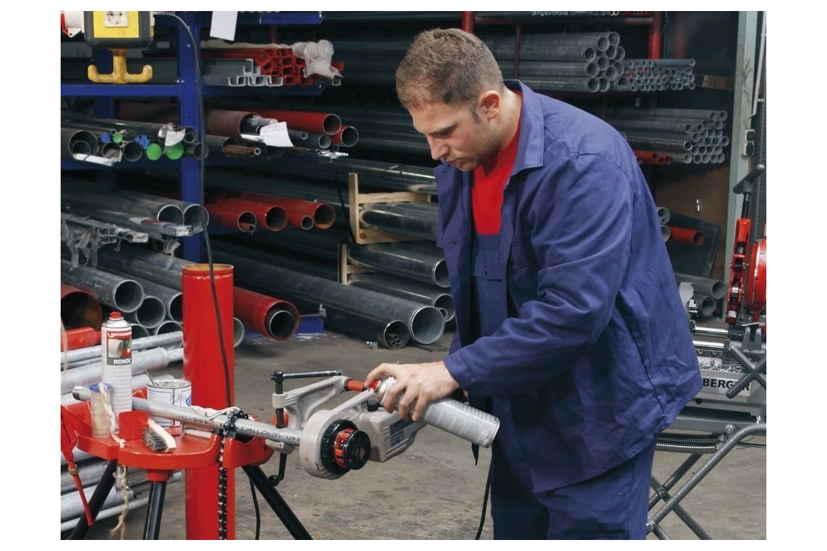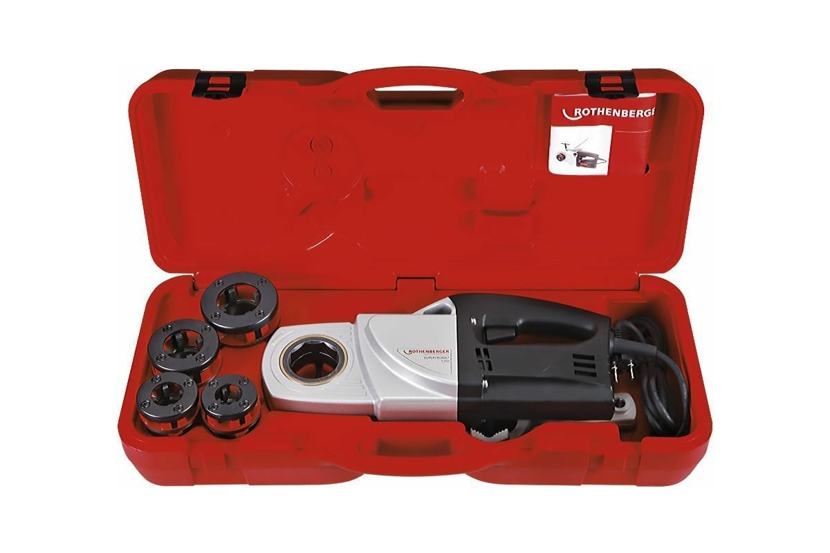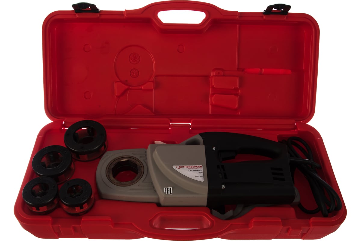 Ручной электроклупп Rothenberger СУПЕРТРОНИК 1250 d= 1/2", 3/4", 1", 1 1/4" 71450 служит для быстрого изготовления прецизионных высокоточных резьбовых соединений на стальных трубах BSPT (правая) D 1/2-1,1/4" в соответствии с нормами.