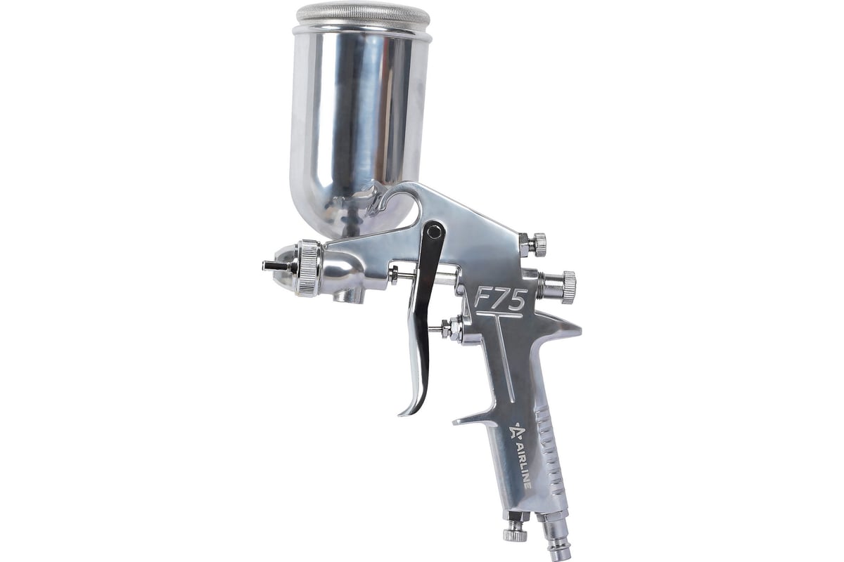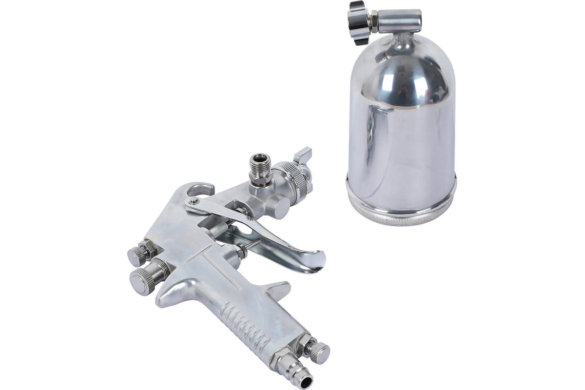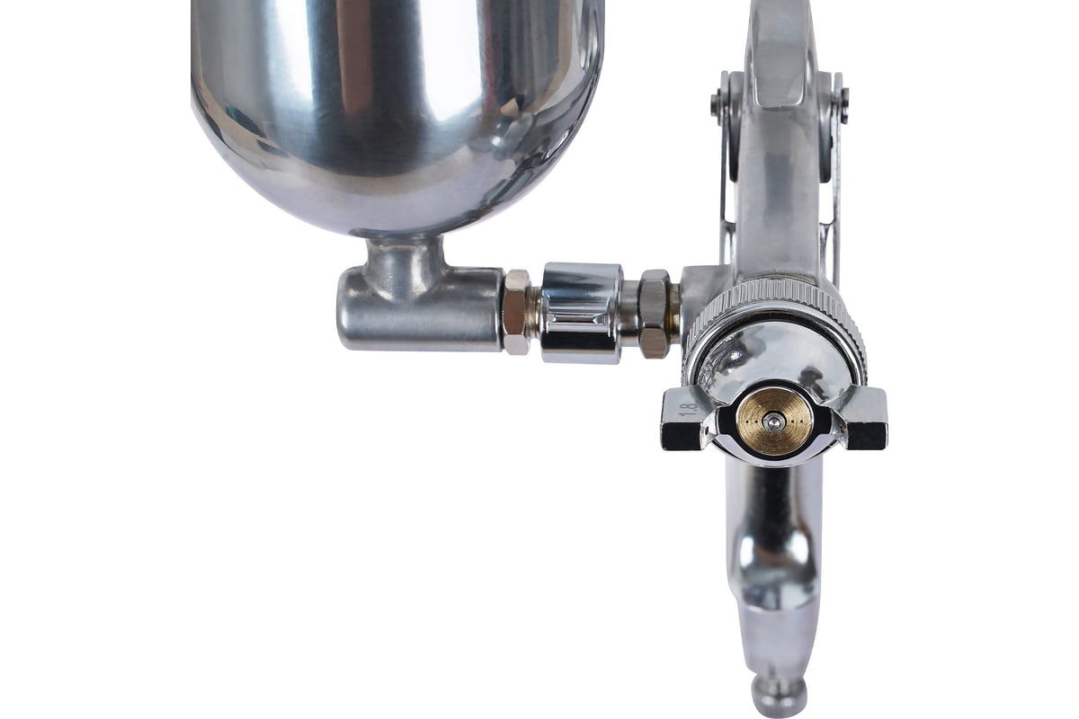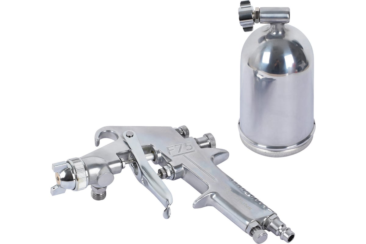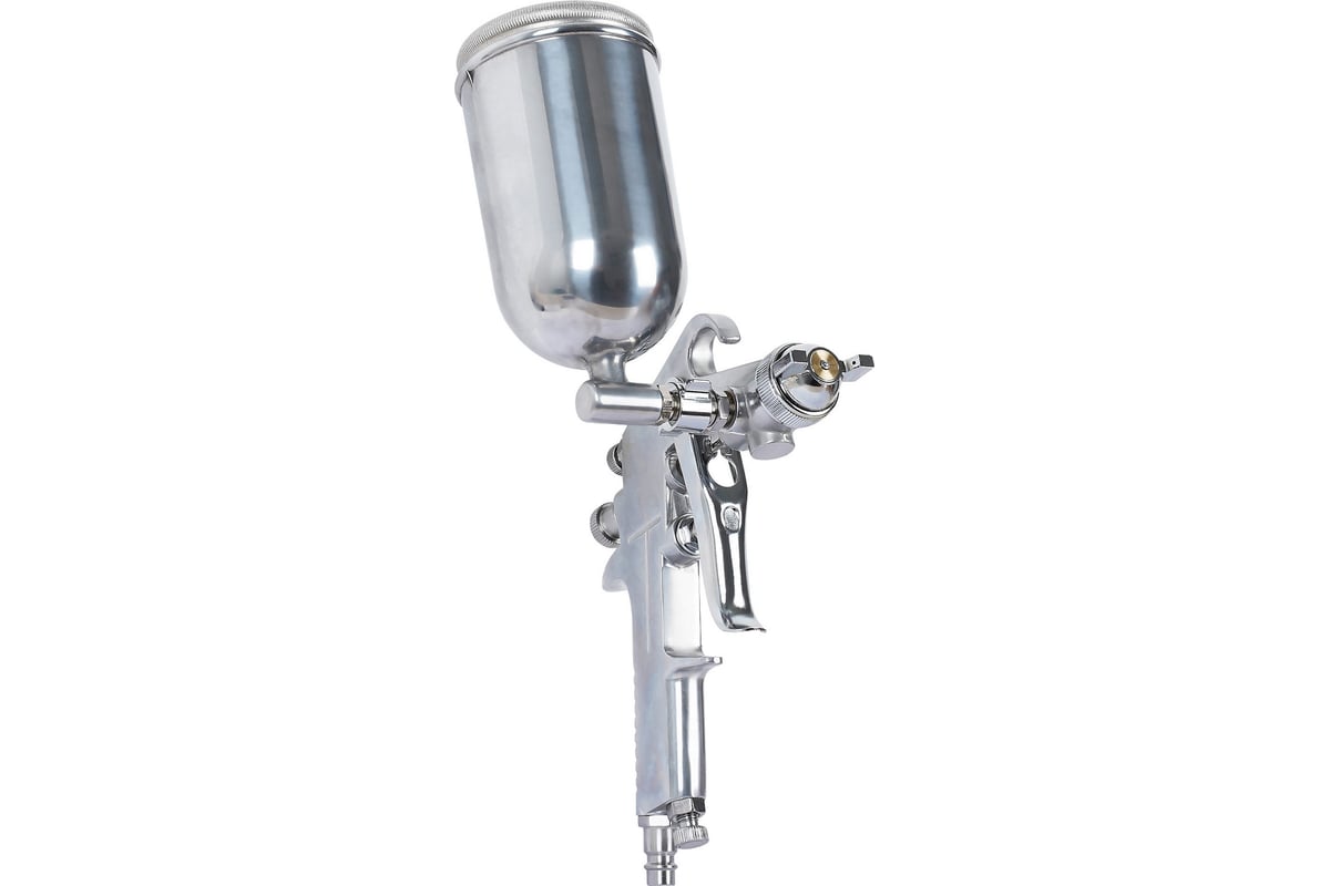 предназначен для малярных работ. Инструмент оснащен регулировками подачи воздуха, формы факела и регулировкой подачи краски. Бачок выполнен из нержавеющей стали, что добавляет ему прочности во время взаимодействия с лакокрасочными материалами. Положение бачка относительно краскопульта можно изменять в зависимости от необходимости нанесения материала в разных плоскостях.
