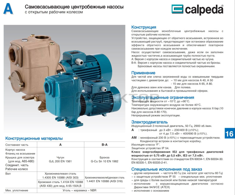 Насосные агрегаты типа A - моноблочные самовсасывающие центробежные насосы с открытым рабочим колесом. В корпусе насоса установлен обратный клапан, предотвращающий обратное течение жидкости при отключении насоса и обеспечивающий повторное самовсасывание при каждом последующем включении. Корпус насоса и рабочее колесо выполнены из чугуна, вал из нержавеющей стали. Насосы способны перекачивать воду с температурой до 90 °С