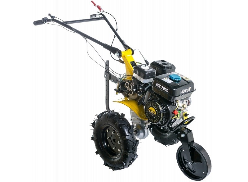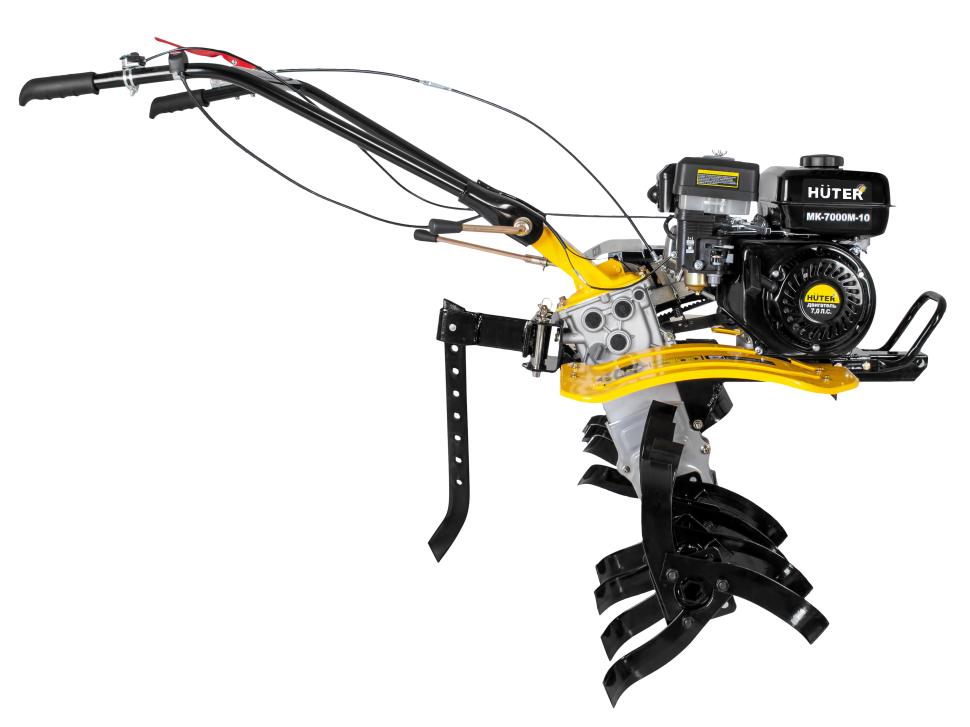 Сельскохозяйственная машина HUTER МК-7000P-10 используется для обработки почвы методом культивации, то есть её рыхления без переворота почвы, выравнивания, других операций. Агрегат дает хорошие результаты на приусадебных и фермерских хозяйствах и дачных участках, на ограниченных территориях, междурядьях, на клумбах и возле деревьев. Агрегат имеет бензиновый двигатель мощностью 7 лошадиных сил и три передачи, две вперед и одну назад. Для удобства оператора все переключатели находятся на ручках агрегата, а резиновые накладки обеспечивают удобное удержание. Металлический щиток предотвращает попадание грунта на оператора и двигатель. Ширина обработки 1 метр вместе с топливным баком в 3,6 литра позволяют обрабатывать большие территории без дозаправки.