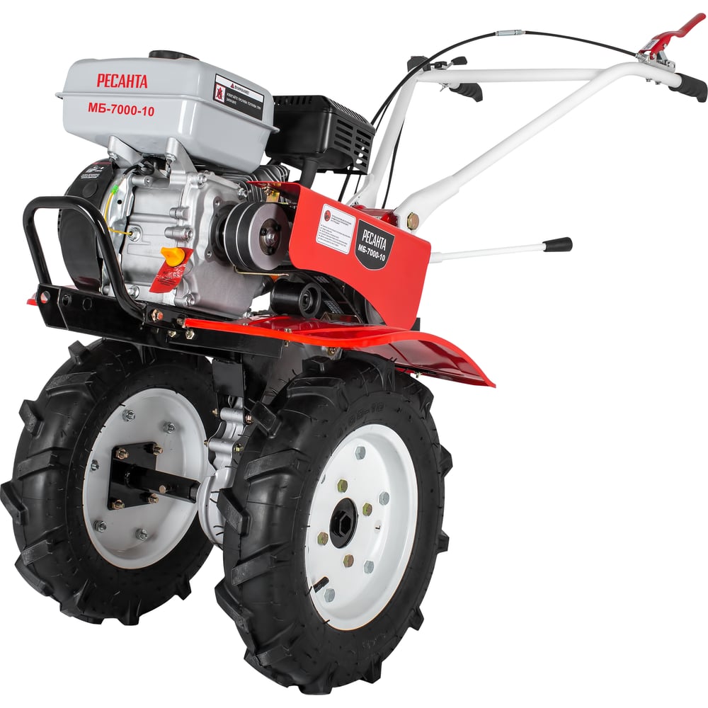 Модель мотоблока МБ-7000P-10 Ресанта используется для проведения работ на участках небольших фермерских и приусадебных участках. Мотоблок оснащён надёжным бензиновым 4-тактным, одноцилиндровым, двигателем, мощность которого составляет 7 л.с. и стальными закалёнными фрезами, что позволяет справляться с любыми почвами. Воздушный фильтр с масляной ванной обеспечивает устойчивую работу в условиях сильной запылённости. Корпус редуктора сделан из алюминия, тип редуктора: шестеренчато-цепной. Объём топливного бака – 3.6 л. Расход топлива – 375 гр/кВт в час. Ширина обработки – 100см. Диаметр фрез: 30 см, глубина обработки регулируется сошником. МБ-7000 P-10 Ресанта имеет две передачи вперёд и одну назад, которые делают эту сельскохозяйственную машину более маневренной. Модель отличается хорошей проходимостью, так как машина получила большие колёса – 4х10 с глубоким протектором. Специальные щитки защитят оператора от комьев земли и пыли. Управление вынесено на рукояти, ручки прорезиненные с рельефным покрытием. Ресанта МБ-7000 P-10 относится к универсальным моделям средней тяжести для небольшой площади. Мотоблок имеет возможность монтажа активного навесного оборудования через ременной привод: косилок, ворошилок, картофелекопалок.