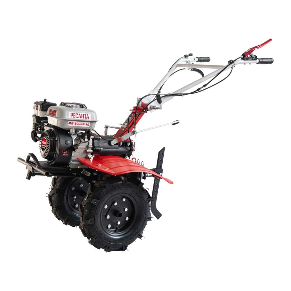 Сельскохозяйственная машина МБ-8000P-10 Ресанта— используется для обработки грунта на больших фермерских участках, на приусадебной территории или огородах. Диаметр закаленных фрез 30 см, глубина регулируется сошником, ширина вспашки - 100 см. Универсальные колеса 4х10 подходят для всех видов эксплуатации.Мотоплуг работает на бензиновом 4-х тактном одноцилиндровом двигателе, мощностью 8 л.с. Усиленная поршневая группа с хромированным покрытием обеспечивает надежную работу машины. Датчик масла обезопасит двигатель от поломок: при низком уровне масла мотоблок заглохнет и не запустится. Объем топливного бака составляет 3,6 л. Расхода топлива 375 г/кВтч позволяет долго работать без дозаправки.Мотоблок имеет шестеренчатый редуктор в масляной ванне в чугунном корпусе, что позволяет обрабатывать тяжелую почву. Привод ВОМ 14 надежно сопрягает мотоблок с активной навеской. Машина имеет три передачи: 2 вперед, 1 назад. Наличие задней передачи улучшает маневренность и позволяет легко извлекать фрезы из грунта.Широкие крылья защищают оператора, а ручки с переключателями обеспечивают удобство управления агрегатом.