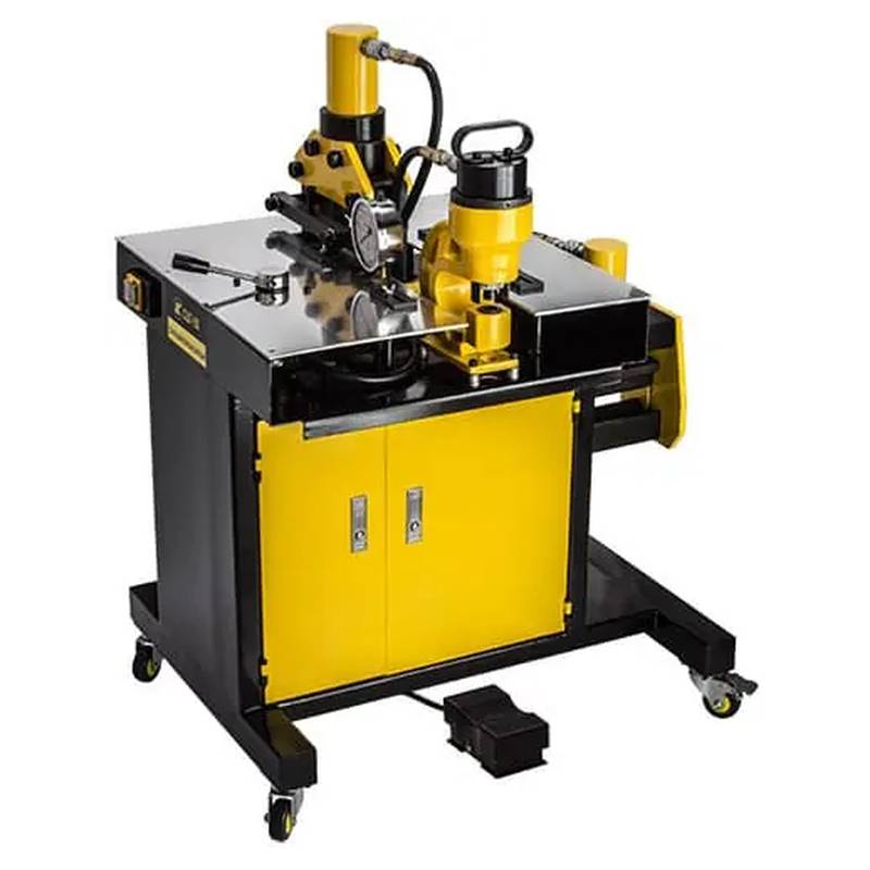 Станок шинообрабатывающий универсальный гидравлический СШГ-200 предназначен для резки, гибки и перфорации электротехнических шин толщиной до 10 мм и шириной до 200 мм. Шинообрабатывающий станок СШГ состоит из шиногиба, шинореза и шинодыра, закрепленных на передвижном столе. Внутри стола установлена маслостанция высокого давления, которая соединена с гидравлическим распределителем с помощью рукава высокого давления (РВД). Маслостанция оснащена электромагнитным клапаном сброса давления и управляется полностью педалью. Педаль имеет три положения: среднее положение - двигатель и магнит клапана сброса давления выключены, два крайних рабочих положения - включен либо двигатель, либо клапан сброса давления. Ручной распределитель имеет пять положений. Крайнее левое, крайнее правое и среднее - для работы с одним из трех инструментов, а два промежуточных положения - для сброса давления (для возврата штока). От распределителя идут три РВД с быстроразъемными соединениями (БРС) на конце, для подключения инструментов. На столе рядом с распределителем установлен манометр для контроля рабочего давления.