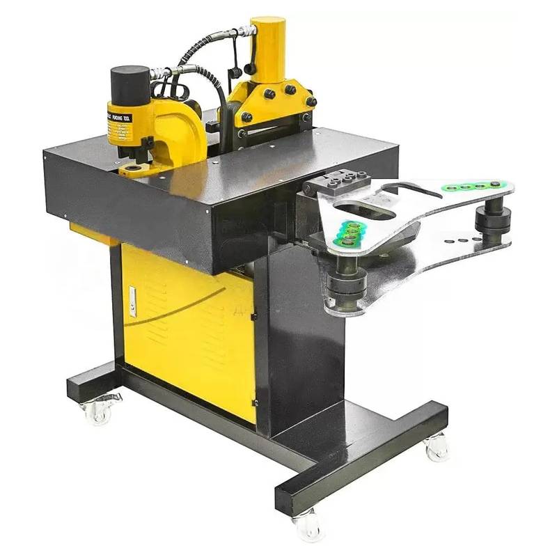 Шинообрабатывающий станок СШГ-200Р (ширина до 200 мм, толщина до 12 мм), в комплекте с шиногибом на ребро ШГГ-125Н-Р. Диаметры насадок: 7, 9, 10.5, 13.8, 17, 20.6 мм. Максимальная ширина шины для данной модели - 200 мм. Станок оснащен всеми необходимыми приспособлениями для оперативной обработки электротехнических шин: в его состав входят шинорез, шинодыр и шиногиб на ребро, которые закреплены на передвижном столе и проводятся в действие электрогидравлической насосной станцией, которая подключается к сети переменного тока 220В. Шланги высокого давления соединяют электрогидравлическую насосную станцию с шинообрабатывающими инструментами через гидравлический переключатель.