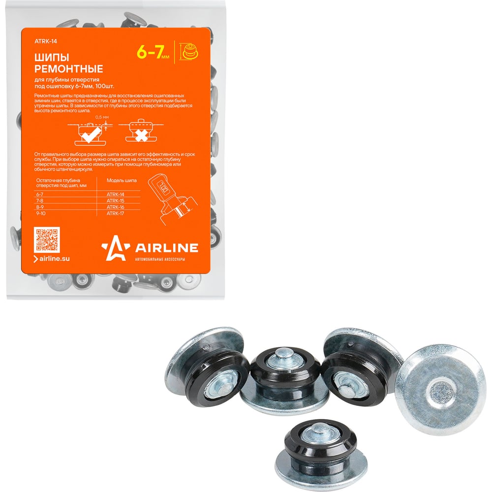 Ремонтные шипы Airline 6-7 мм, 100 шт., в пакете, со стикером ATRK-14 предназначены для воcстановления шипованных зимних шин, ставятся в отверстия, где в процессе эксплуатации были утрачены шипы. В зависимости от глубины этого отверстия подбирается высота ремонтного шипа. Специальная форма шипа, увеличенный диаметр фланца (12 мм), материал втулки обеспечивают его надежное удержание в протекторе зимней шины.