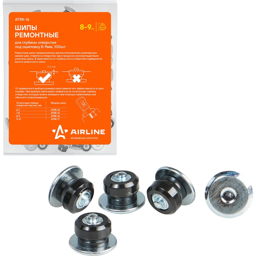 Ремонтные шипы Airline 8-9 мм, 100 шт., в пакете со стикером ATRK-16 предназначены для воcстановления шипованных зимних шин, ставятся в отверстия, где в процессе эксплуатации были утрачены шипы. В зависимости от глубины этого отверстия подбирается высота ремонтного шипа. Специальная форма шипа, увеличенный диаметр фланца (12 мм), материал втулки обеспечивают его надежное удержание в протекторе зимней шины.