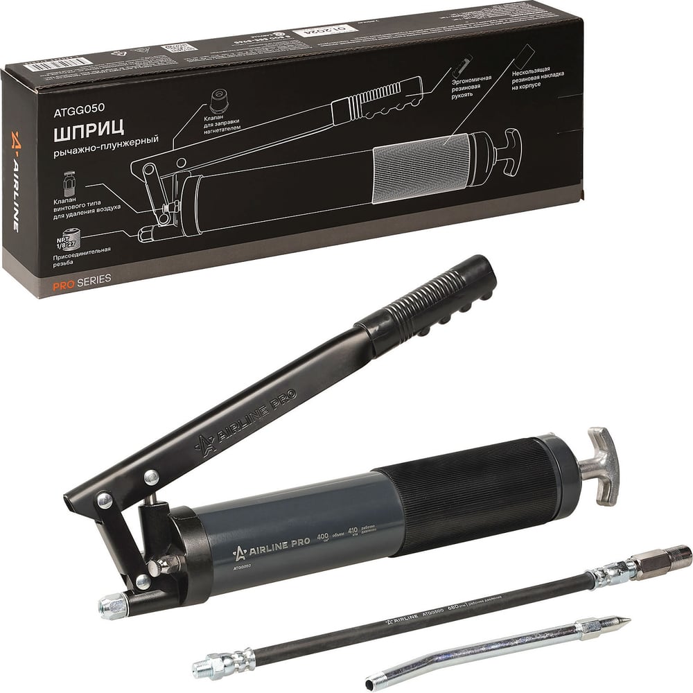 Шприц рычажно-плунжерный 400мл PRO, клапан уд. воздуха (возможно примен. картриджа) AIRLINE ATGG050 Шприц рычажно-плунжерный AIRLINE ATGG050 предназначен для нагнетания пластичной (консистентной) смазки в различные узлы и агрегаты, подверженные трению. Производится из высокопрочной стали на автоматизированном оборудовании. Применяется для обслуживания легковых автомобилей, грузовых, тракторов, спецтехники, промышленного оборудования и станков. Изделие имеет возможность заправки тремя способами: с помощью картриджа (туба со смазкой 400гр), ручным способом (шпателем/из емкости) и нагнетателем смазки через специальный клапан. На головке шприца имеется специальный высокоэффективный клапан винтового типа для удаления воздуха. Шприц комплектуется резиновым износостойким шлангом 300мм, усиленной стальной трубкой 150мм, а также четырехлепестковым и коническим наконечником. Данная модель оснащена резиновой рукоятью для повышения удобства эксплуатации и нескользящей резиновой накладкой, которая способствует улучшенному сцеплению с цилиндрическим корпусом шприца при работе. Состав: алюминий/сталь/резина Количество плунжеров: 1 Рабочее давление, Мпа: 41 Максимальное давление, Mпа: 55 Работа одной рукой: нет Работа двумя руками: да Ёмкость смазки, см.куб.: 400 Рабочее давление, атм: 410 Максимальное давление, aтм: 545 Работа с картриджем: Есть