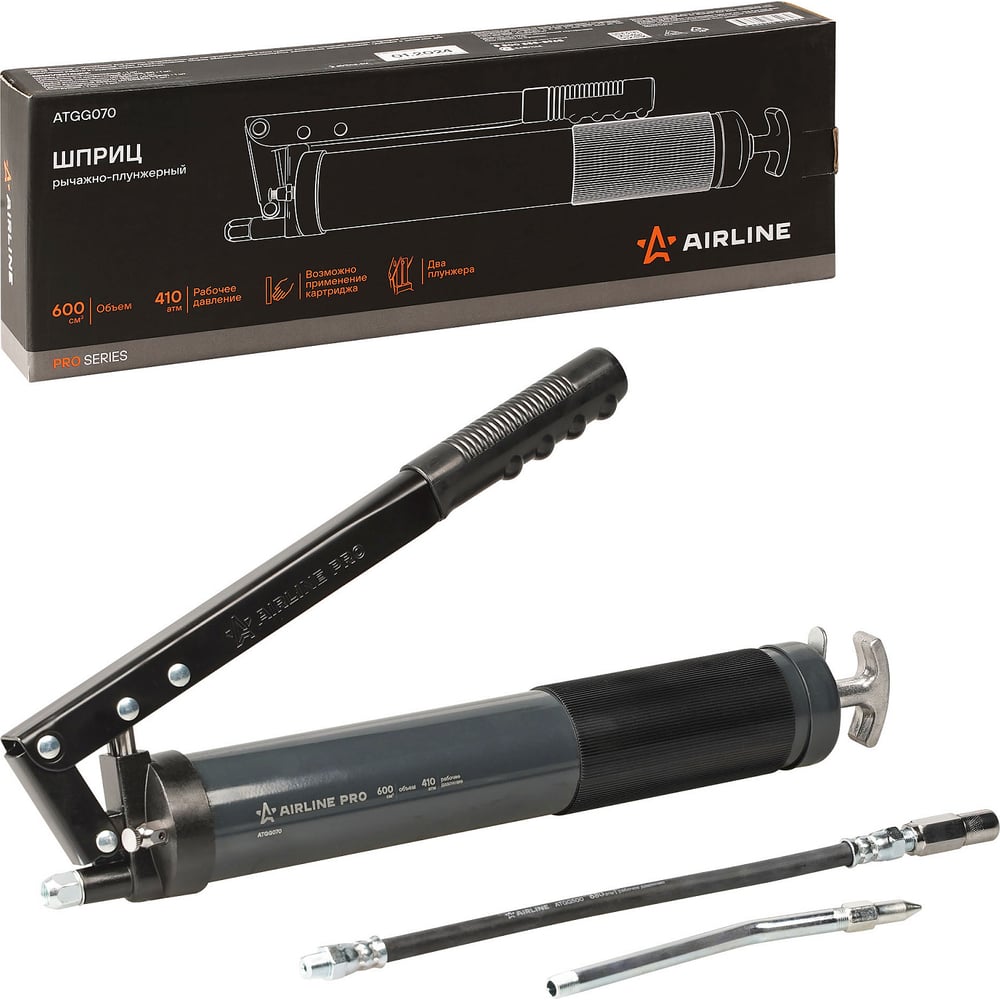 Шприц двухплунжерный 600мл PRO, клапан уд. воздуха (возможно примен. картриджа) AIRLINE ATGG070 Шприц двухплунжерный AIRLINE ATGG070 предназначен для нагнетания пластичной (консистентной) смазки в различные узлы и агрегаты, подверженные трению. Производится из высокопрочной стали на автоматизированном оборудовании. Применяется для обслуживания легковых автомобилей, грузовых, тракторов, спецтехники, промышленного оборудования и станков. Изделие имеет возможность заправки тремя способами: с помощью картриджа (туба со смазкой 400гр), ручным способом (шпателем/из емкости) и нагнетателем смазки через специальный клапан. Два плунжера обеспечивают повышенную производительность при работе. На головке шприца имеется специальный высокоэффективный клапан винтового типа для удаления воздуха. Шприц комплектуется резиновым износостойким шлангом 300мм, усиленной стальной трубкой 150мм, а также четырехлепестковым и коническим наконечником. Данная модель оснащена резиновой рукоятью для повышения удобства эксплуатации и нескользящей резиновой накладкой, которая способствует улучшенному сцеплению с цилиндрическим корпусом шприца при работе. Состав: алюминий/сталь/резина Рабочее давление, Мпа: 41 Максимальное давление, Mпа: 55 Работа одной рукой: нет Работа двумя руками: да Ёмкость смазки, см.куб.: 600 Рабочее давление, атм: 410