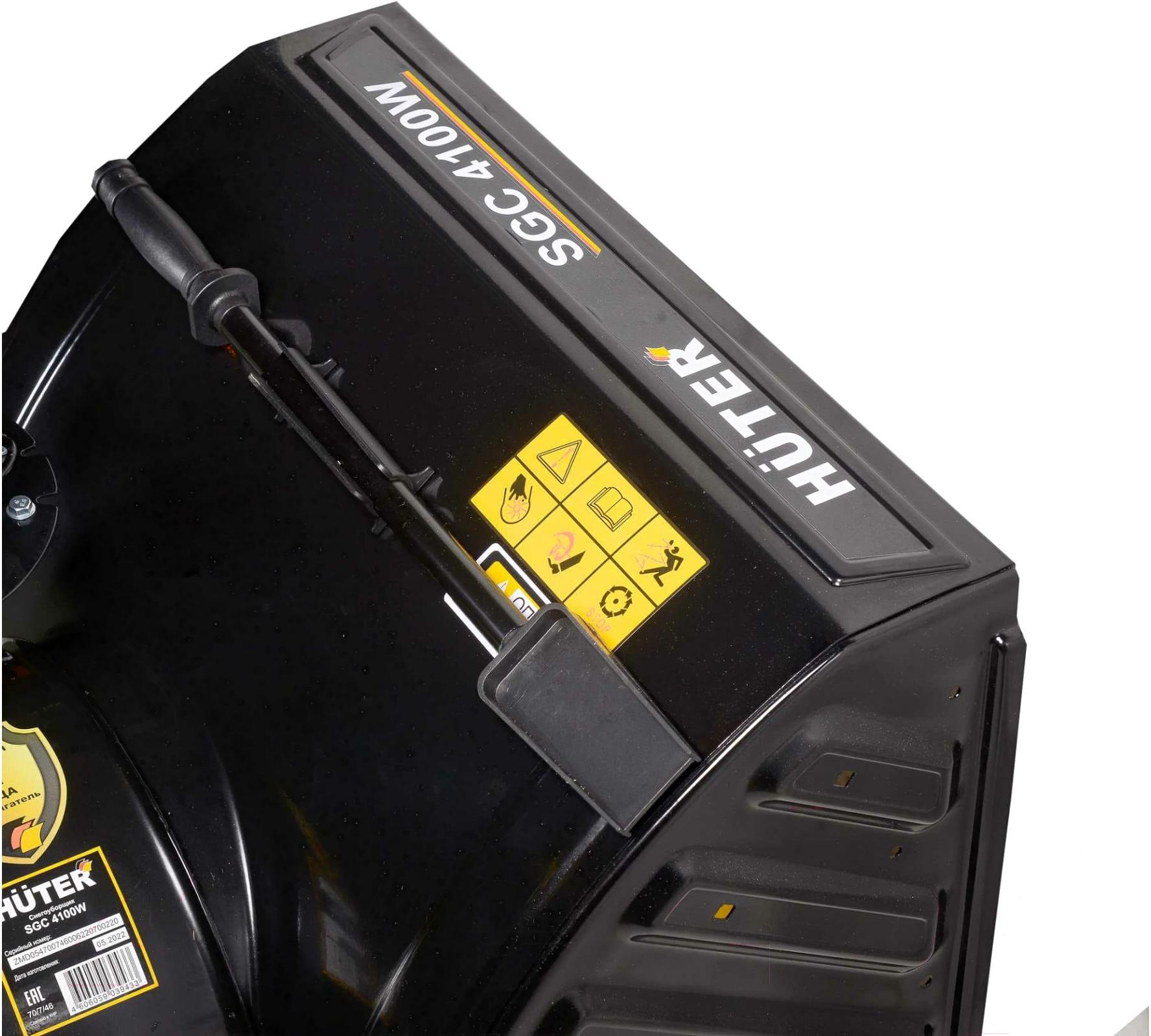 Снегоуборщик Huter SGC 4100W требует минимальных усилий оператора для направления в нужную сторону. Это очень снижает энергоемкость рабочего процесса. Колесная модель отличается маневренностью, проста в управлении на ограниченной территории. Ведущие надувные колеса с глубоким протектором обеспечивают сцепление с поверхностью даже в гололед. Желоб для выброса снега поворачивается на 180° с помощью рычага. Ограничительные башмаки снегозаборника исключают попадание камней и других твердых предметов в шнек, позволяют регулировать высоту очищаемой поверхности.
