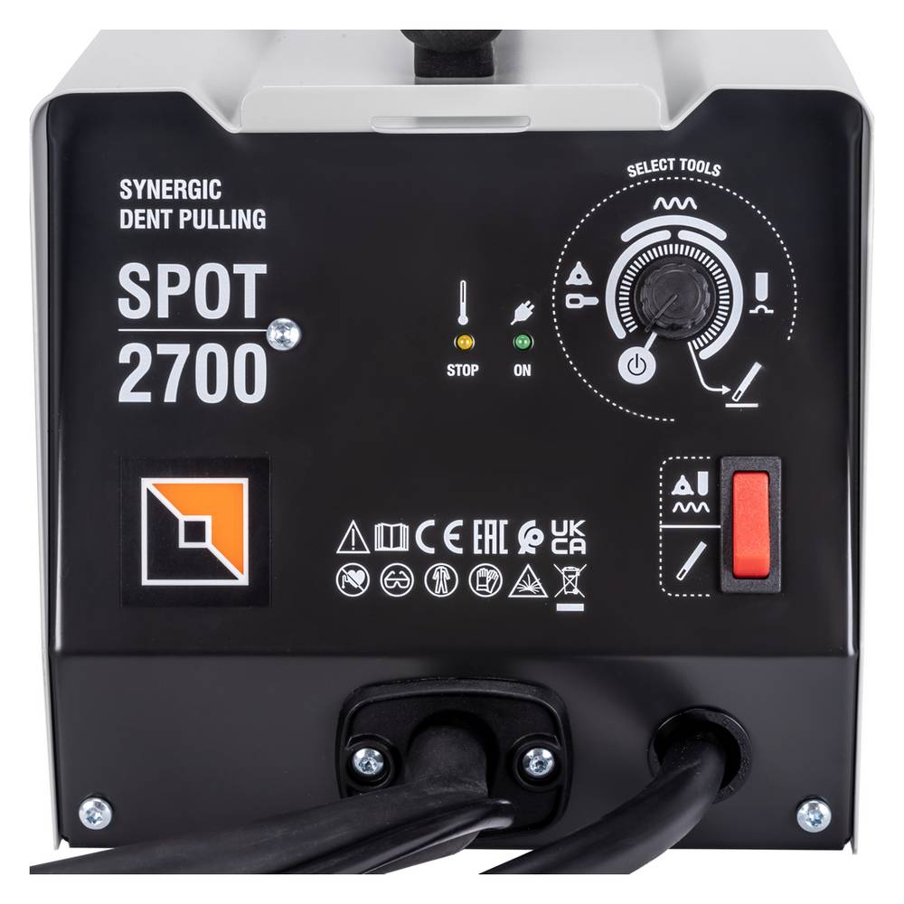 Споттер FoxWeld SPOT 2700 – аппарат для точечной контактной сварки, который применяется при восстановлении геометрии кузовных панелей автотранспортных средств, а также при ремонте стальных тонкостенных элементов. Данный аппарат предназначен для осуществления следующих кузовных работ: рихтование; сварка гвоздиков, заклёпок, кружков и шпилек для накладок; удаление выемок; выравнивание поверхности, устранение вмятин. Аппарат не предназначен для сборки металлических деталей. В качестве источника питания используется бытовая сеть переменного тока 230 В. Использование меди для обмотки силовой катушки трансформатора позволило увеличить силу тока сварки до 2600 А. Этот фактор в сочетании с сетевым предохранителем, увеличивает надежность агрегата.