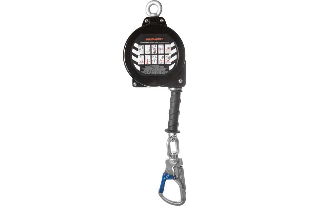 Трос из нержавеющей стали на конце оборудован алюминиевым карабином с раскрытием 25 мм, для крепления к привязи. Карабин снабжен дополнительным вертлюгом с индикатором срабатывания.