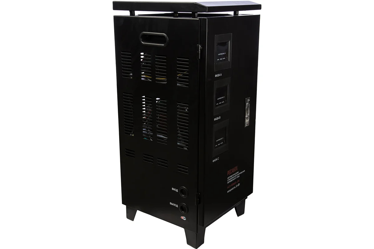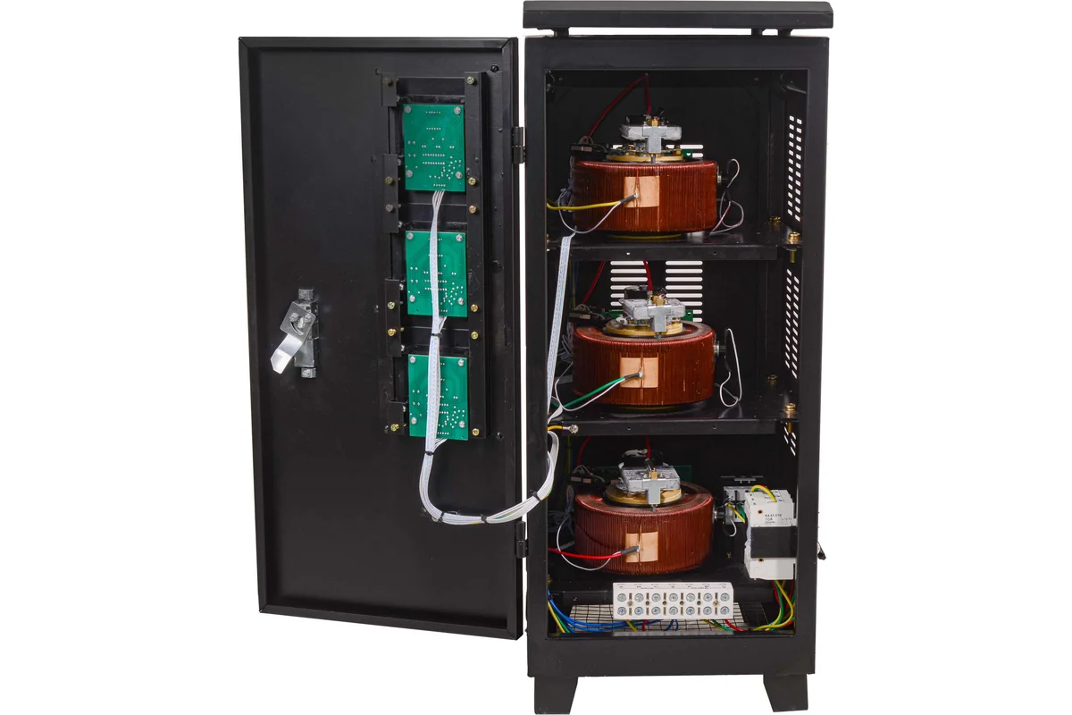 Металлический корпус с естественной вентиляцией и защитой от перегрева гарантирует долговечную работу в различных условиях - от производственных цехов до строительных площадок. На лицевой панели расположены LED-дисплеи для контроля параметров по каждой фазе, а боковые рукоятки и устойчивые опоры обеспечивают удобство транспортировки и установки. Широкий диапазон рабочих температур (-5...+40°C) и влажности (до 80%) делает этот стабилизатор универсальным решением для промышленного и коммерческого применения.