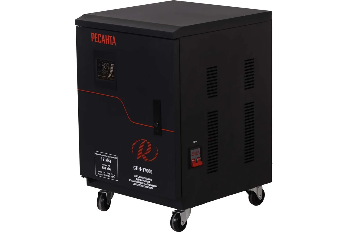 Стабилизатор напряжения Ресанта СПН-17000 — это мощное и эффективное решение для защиты электрооборудования в частных домах, офисах и на производственных объектах. Устройство способно стабилизировать входное напряжение в широком диапазоне от 90 до 260 В, обеспечивая на выходе стабильные 220±8% В всего за 15 мс. Благодаря мощности 17000 Вт стабилизатор надежно защищает от перепадов напряжения, коротких замыканий и высоковольтных импульсов всю технику — от бытовых приборов до профессионального оборудования.