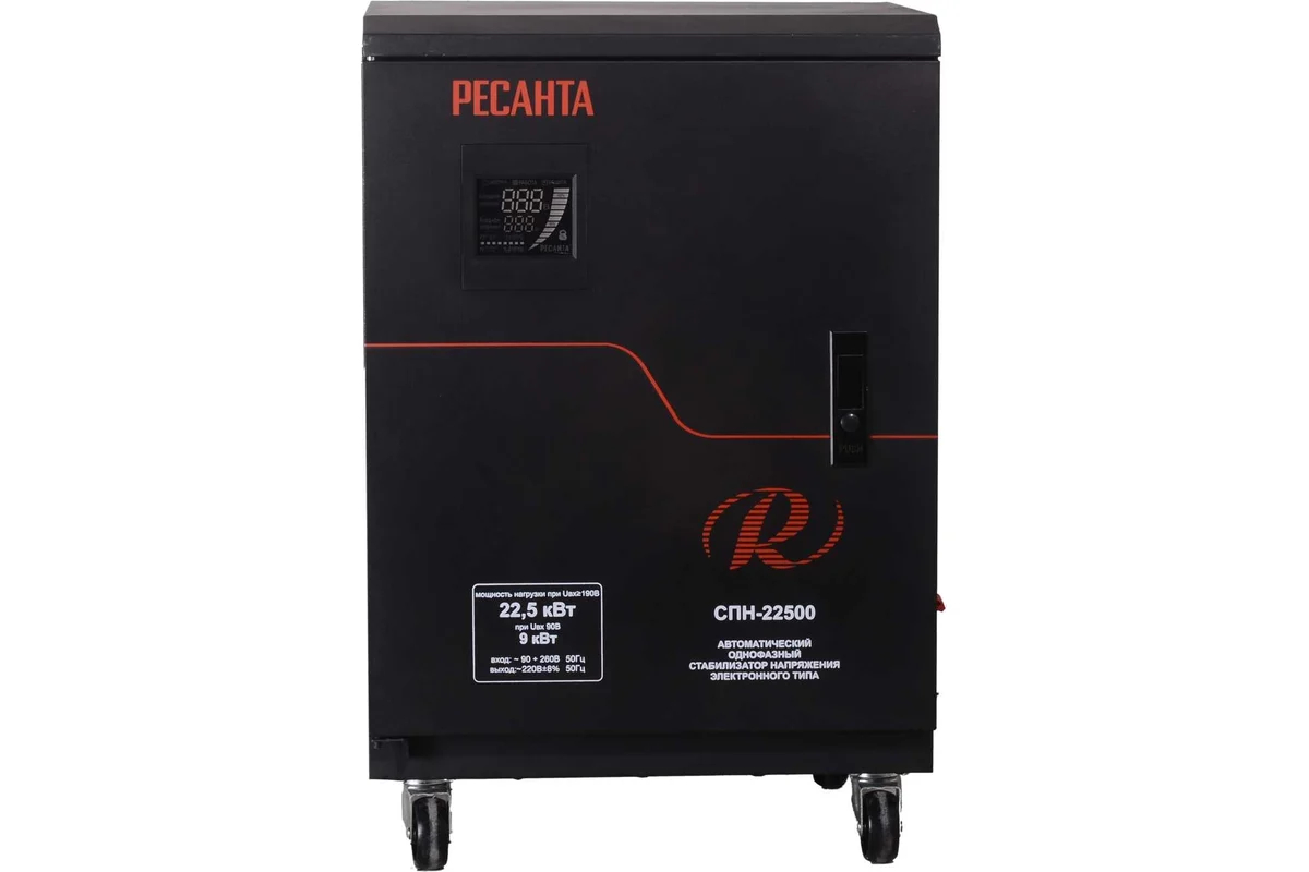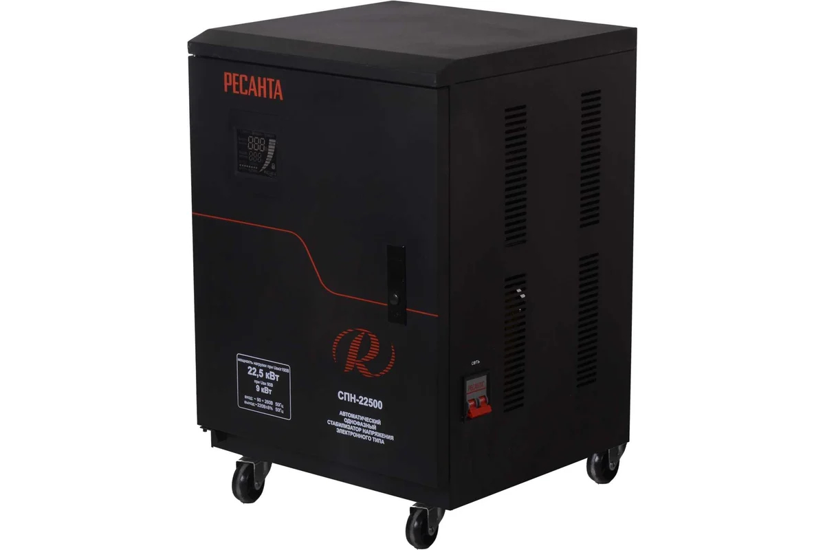 Стабилизатор напряжения Ресанта СПН-22500 представляет собой мощное решение для защиты электрооборудования в частных домах и на малых производствах. Устройство мощностью 22,5 кВТ работает в широком диапазоне входного напряжения 90-260 В и обеспечивает стабильное выходное напряжение 220±8% В с временем реакции до 15 мс.