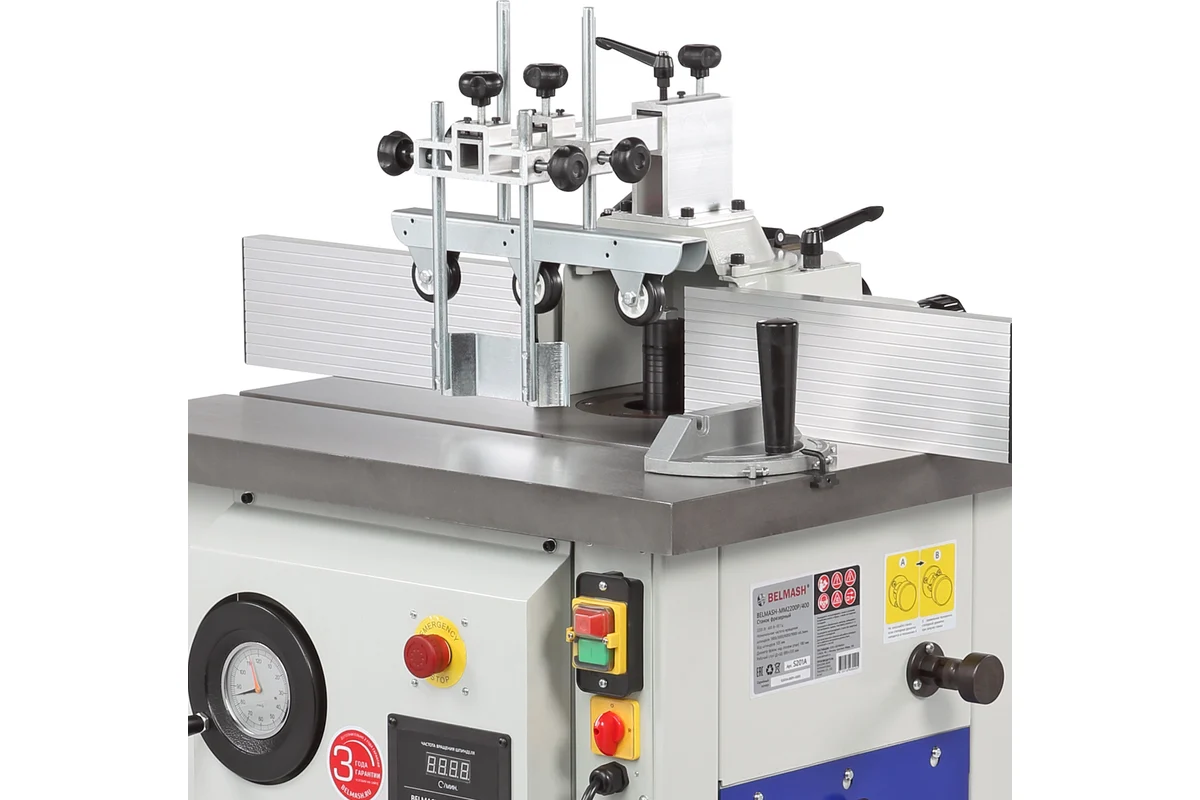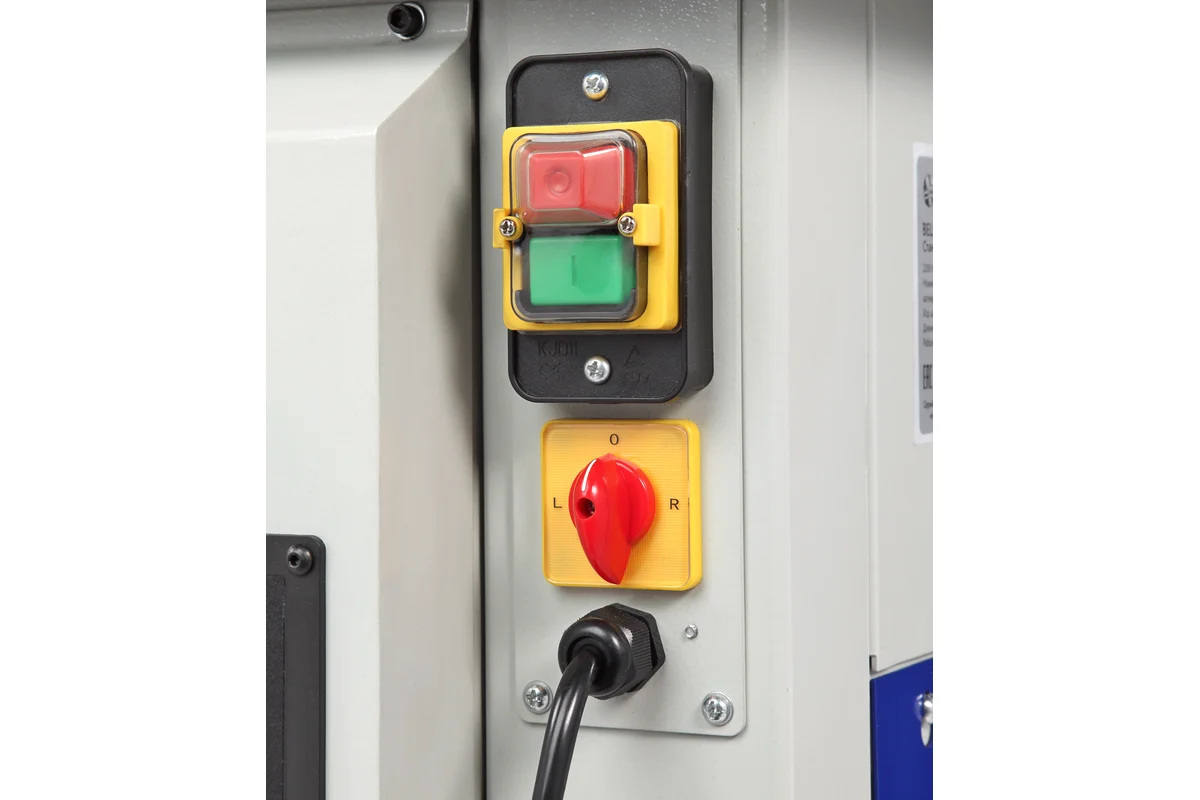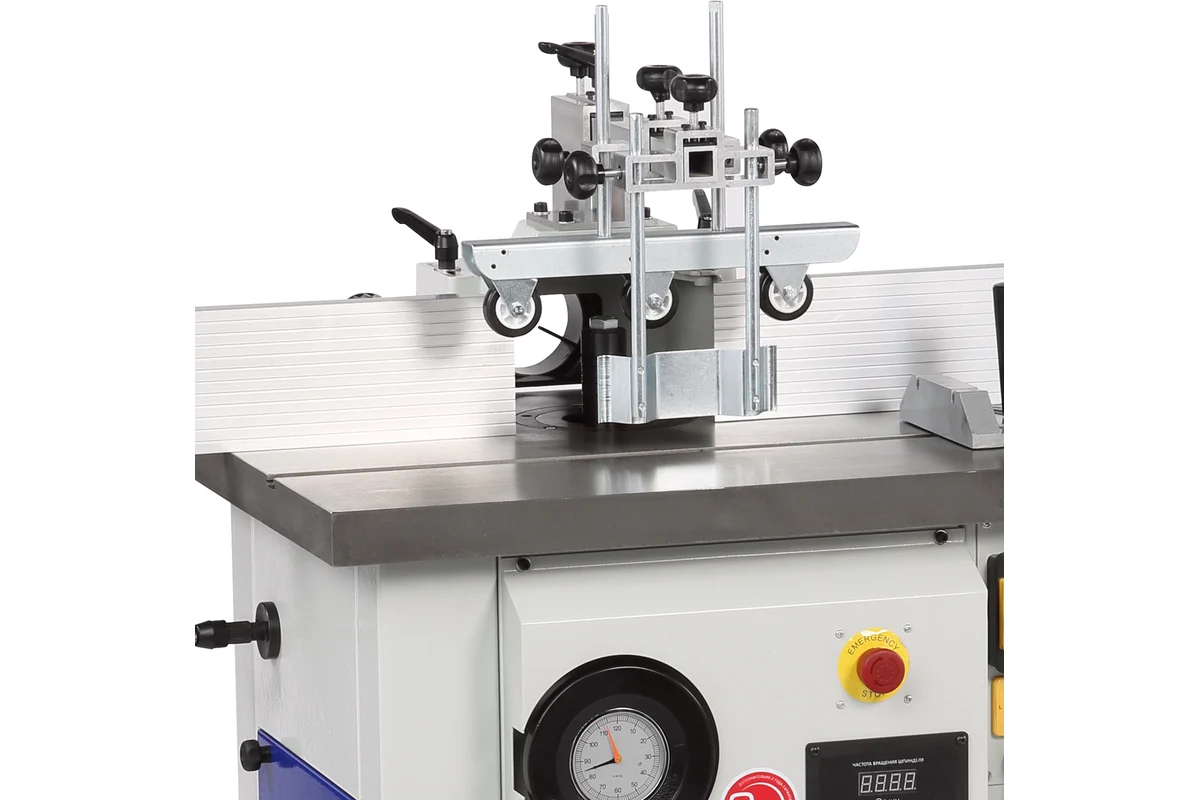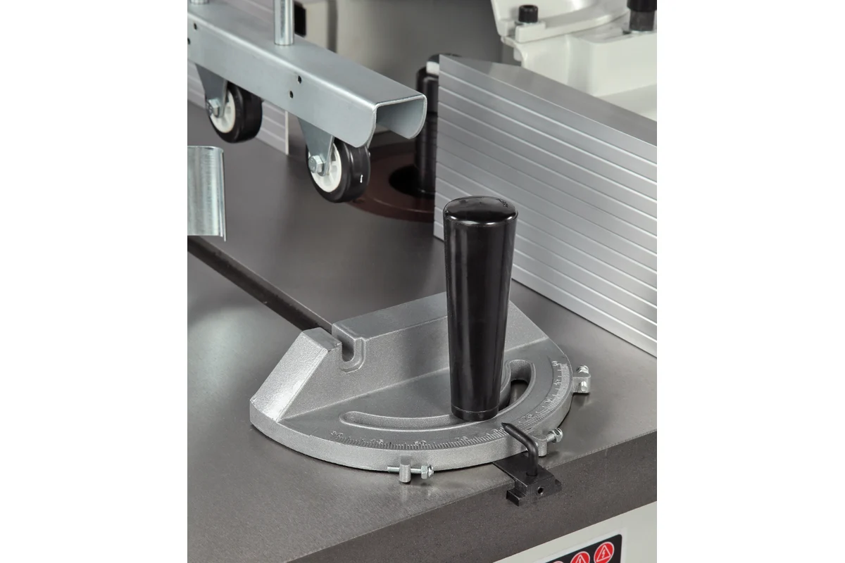 Станок оснащен чугунным рабочим столом со стандартным пазом для установки углового упора или дополнительных приспособлений. Корпус изделия закрытый, изготовлен из листовой стали. Защитный кожух с патрубком для отвода стружки расположен на задней части параллельного упора. Станок оснащен прижимным узлом, который помогает в подаче заготовки к режущему инструменту и осуществляет дополнительную фиксацию.