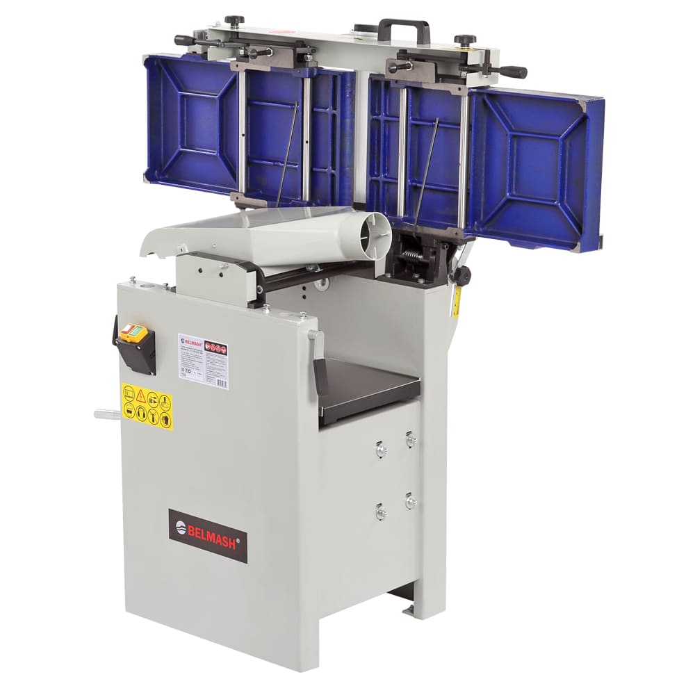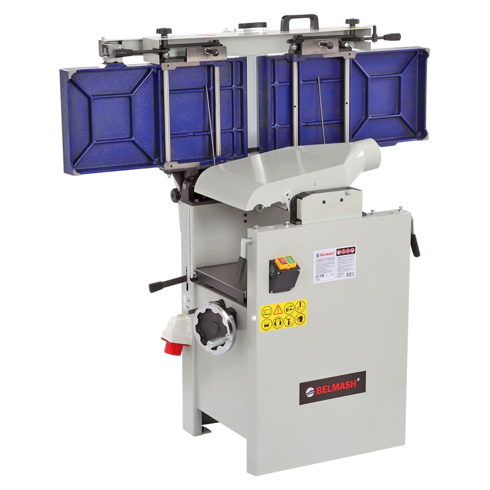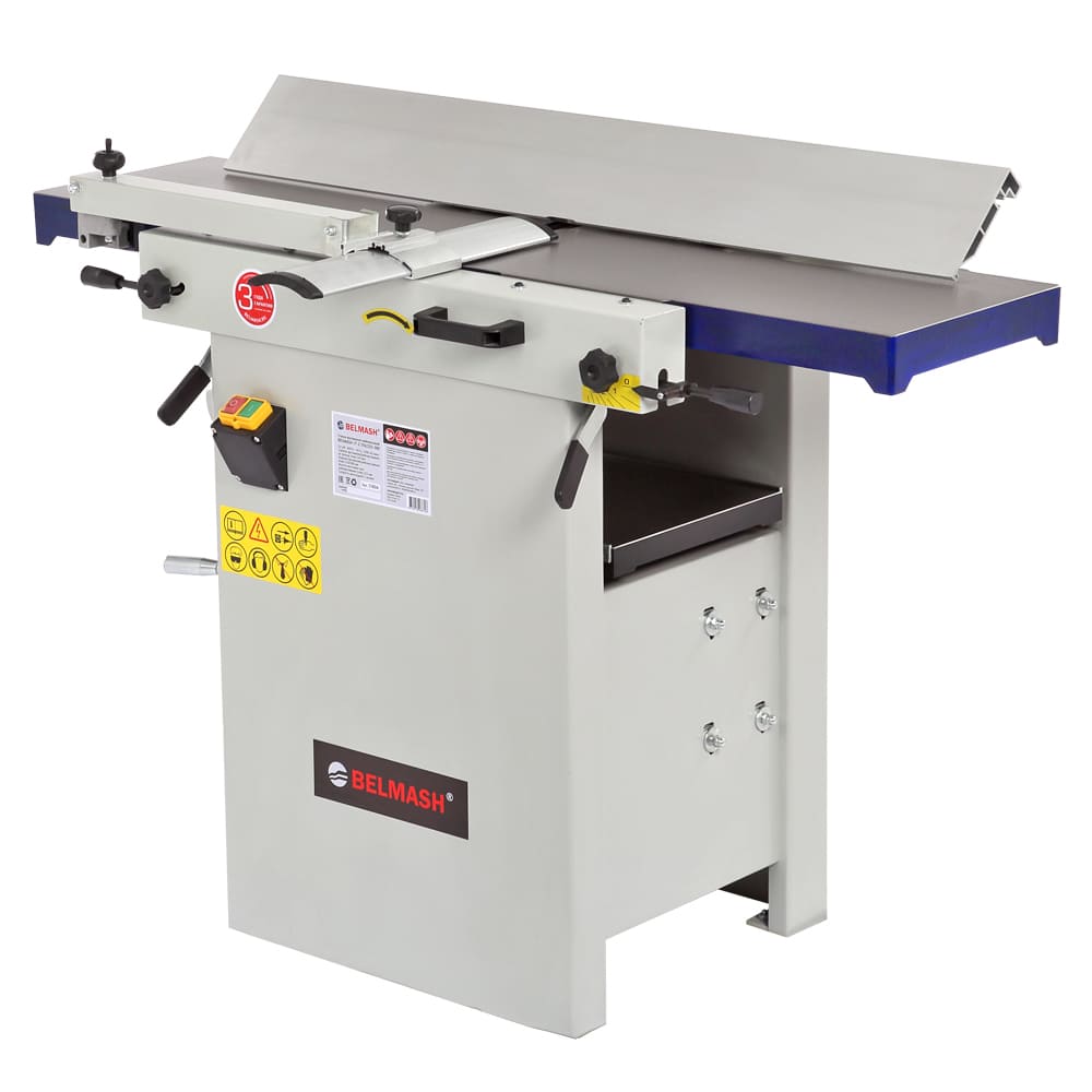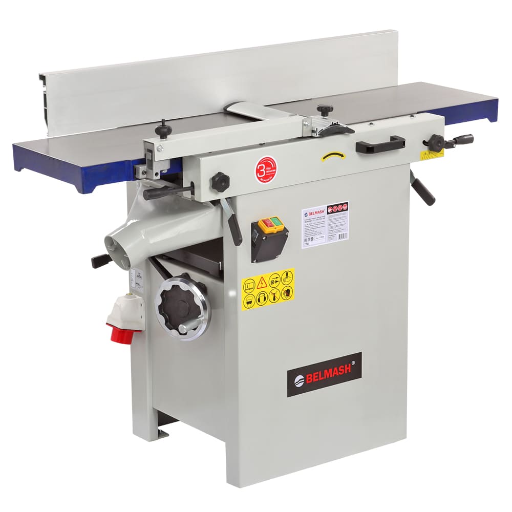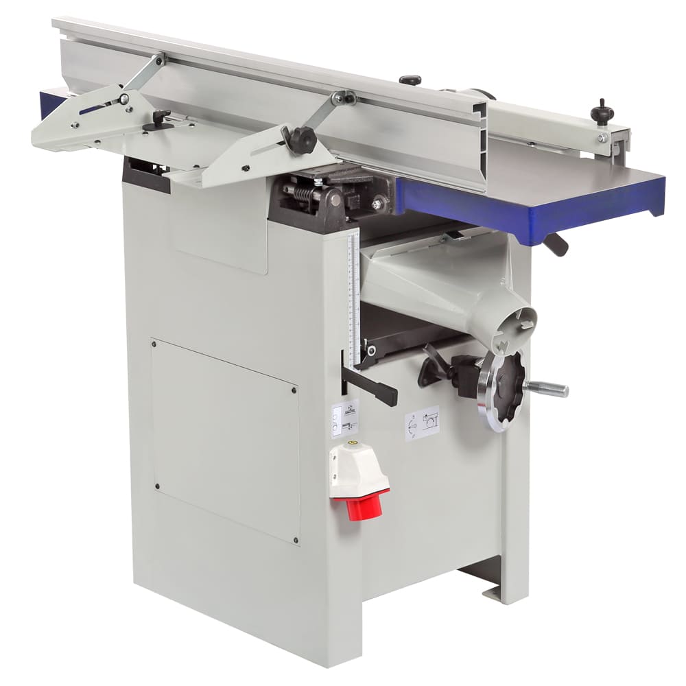 Станок предназначен для фугования и рейсмусования, данное оборудование идеально подходит и совмещает в себе все операции для калибровки доски. ширина обработки составляет 310 мм - это значение достаточно велико по меркам профессиональных рейсмусовых станков, а по меркам фуговальных - и вовсе характерно для оборудования более высокого индустриального класса. Мощность однофазного электродвигателя составляет 3000 Вт. Такое сочетание характеристик делает модель привлекательной не только с точки зрения экономии рабочего пространства, но и возможности выполнения серьезных задач. Вилка (тип 515) для подключения к сети 400 (380) Вольт расположена на корпусе станка. Конструкция станка – одна из самых удачных на рынке: широкое использование массивных чугунных деталей и большой вес гарантирует точную работу без вибраций. При рейсмусовании верхний модуль целиком поднимается и не мешает ни работе, ни стружкоудалению. Отдельного внимания заслуживает удобный эксцентриковый механизм регулировки положения столов, причем как подающего, так и принимающего. Входящий в базовое оснащение вал helical снабжен твердосплавными режущими вставками. Он надежнее и проще в эксплуатации (не нужно никаких регулировок). Частота вращения в 5500 об/мин. также способствует чистому резу. Для строгания по торцу или под углом от 90 до 45 градусов станок оборудован параллельным упором, который выполнен в жесткого алюминиевого профиля. При выборе между двумя специализированными или одним комбинированным станком нужно учитывать, что эта модель точна, удобна и производительна, как специализированные, но потребует несколько более частого обслуживания рейсмусовой части в случае интенсивной эксплуатации.