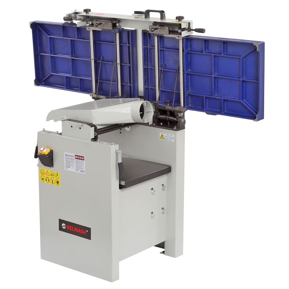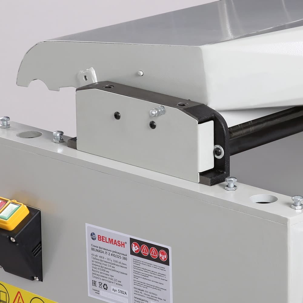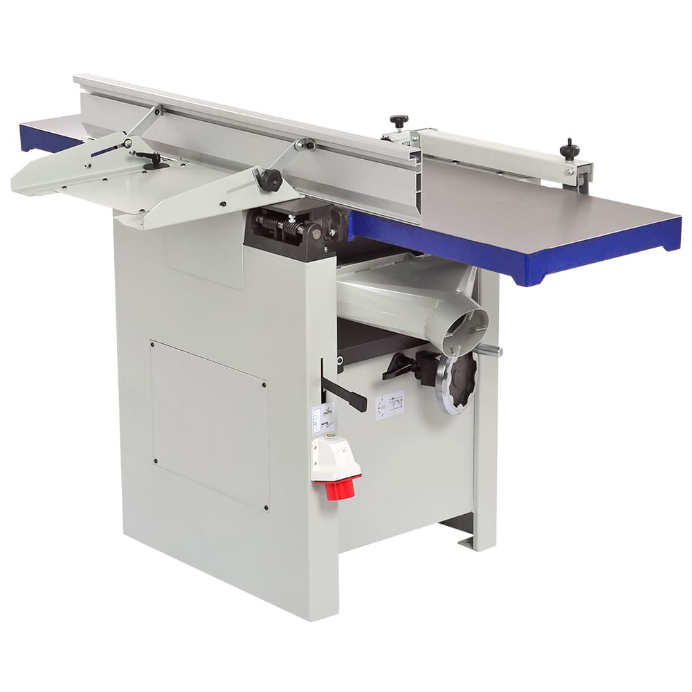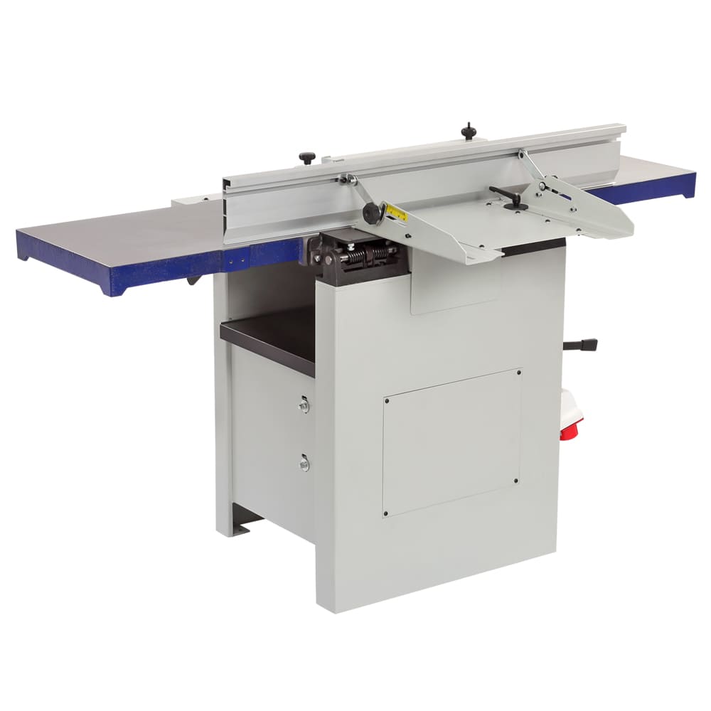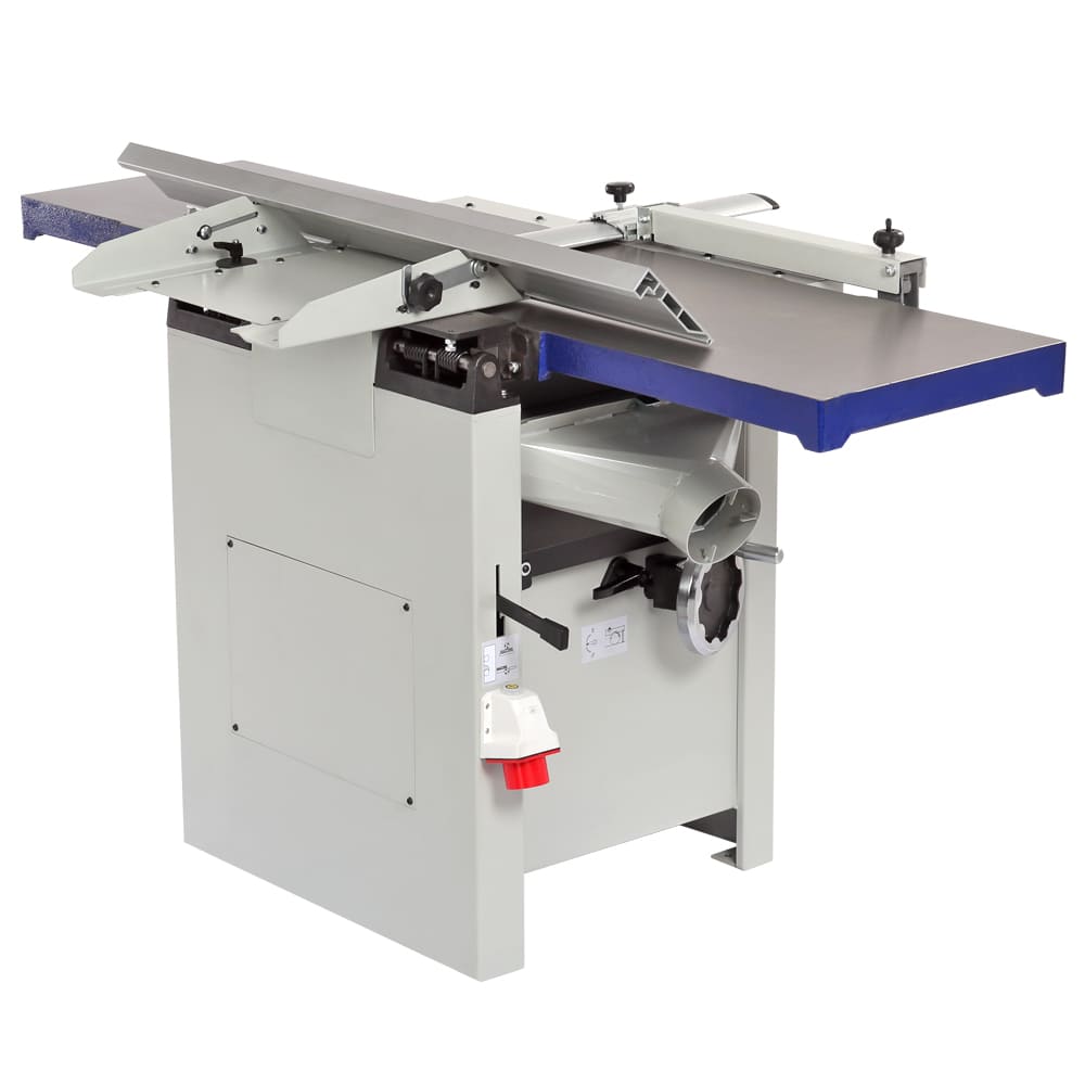 Входящий в базовое оснащение стальной строгальный вал с тремя ножами прост в эксплуатации (имеет стандартные регулировки), а за счет частоты вращения в 5500 об/мин. обеспечивает чистый рез. Для строгания по торцу или под углом от 90 до 45 градусов станок оборудован параллельным упором, который выполнен в жесткого алюминиевого профиля. При выборе между двумя специализированными или одним комбинированным станком нужно учитывать, что эта модель точна, удобна и производительна, как специализированные, но потребует несколько более частого обслуживания рейсмусовой части в случае интенсивной эксплуатации.