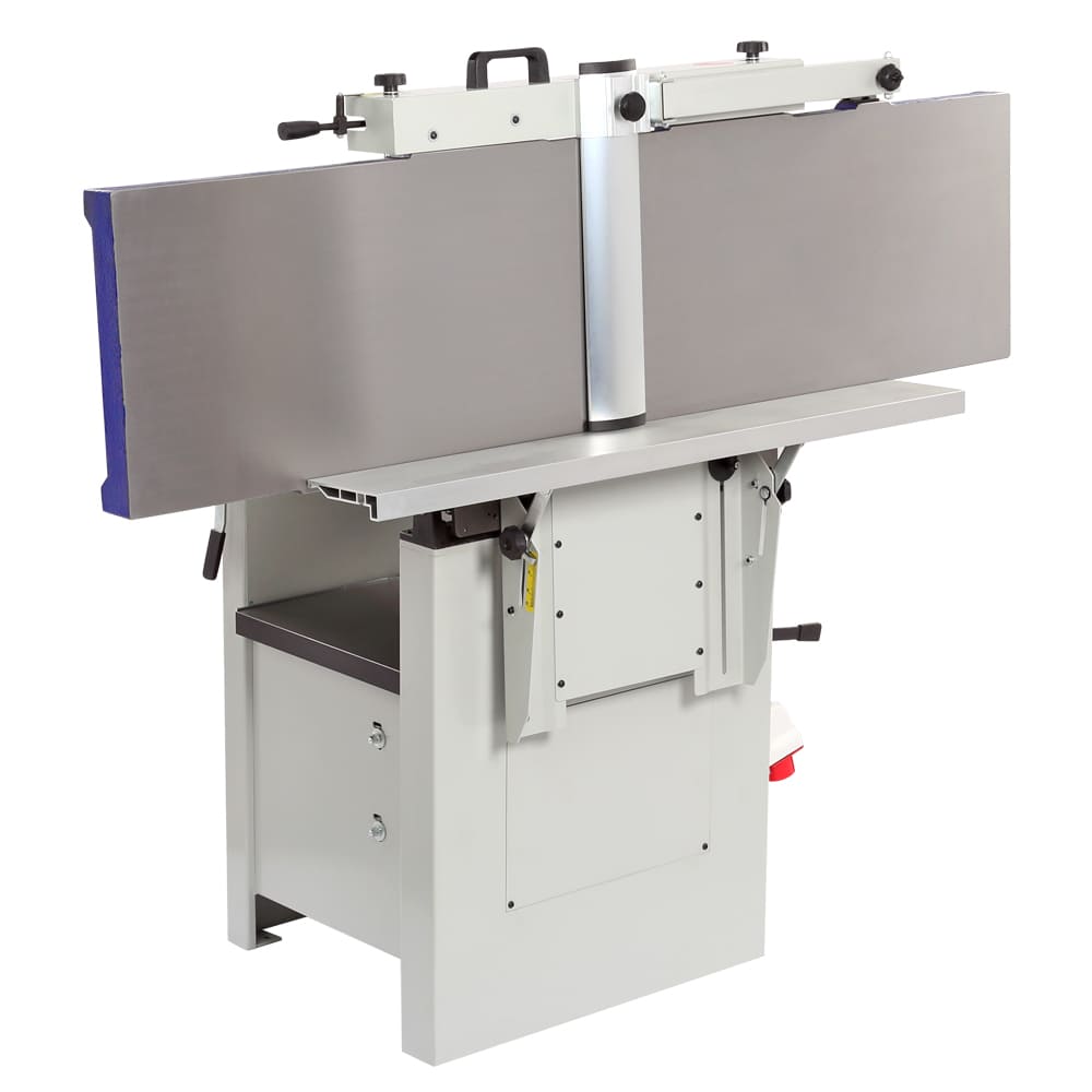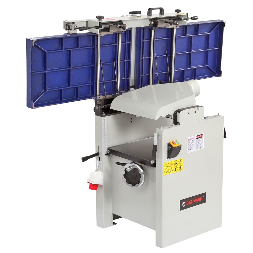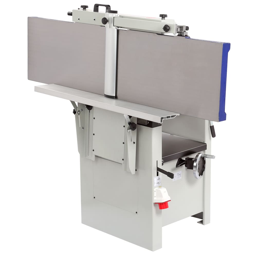 Станок предназначен для фугования и рейсмусования, данное оборудование идеально подходит и совмещает в себе все операции для калибровки доски. ширина обработки составляет 410 мм - это значение достаточно велико по меркам профессиональных рейсмусовых станков, а по меркам фуговальных - и вовсе характерно для оборудования более высокого индустриального класса. Мощность трехфазного электродвигателя составляет 4000 Вт. Такое сочетание характеристик делает модель привлекательной не только с точки зрения экономии рабочего пространства, но и возможности выполнения серьезных задач. Вилка (тип 515) для подключения к сети 400 (380) Вольт расположена на корпусе станка. Конструкция станка – одна из самых удачных на рынке: широкое использование массивных чугунных деталей и большой вес гарантирует точную работу без вибраций. При рейсмусовании верхний модуль целиком поднимается и не мешает ни работе, ни стружкоудалению. Отдельного внимания заслуживает удобный эксцентриковый механизм регулировки положения столов, причем как подающего, так и принимающего.