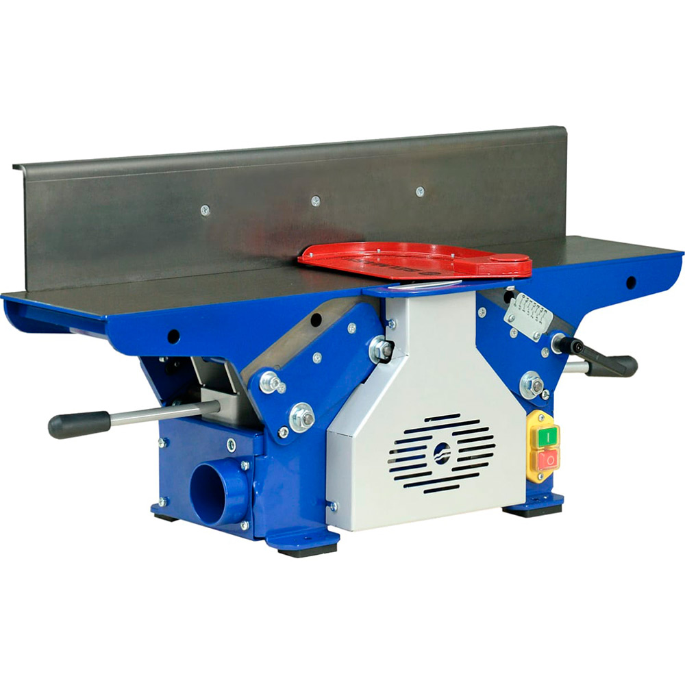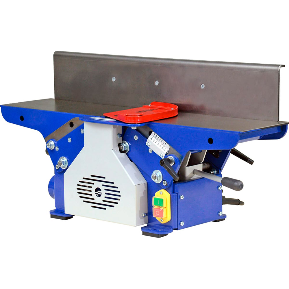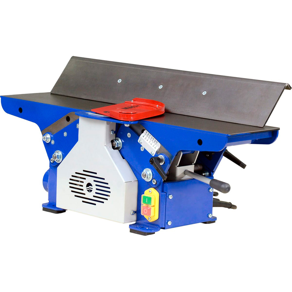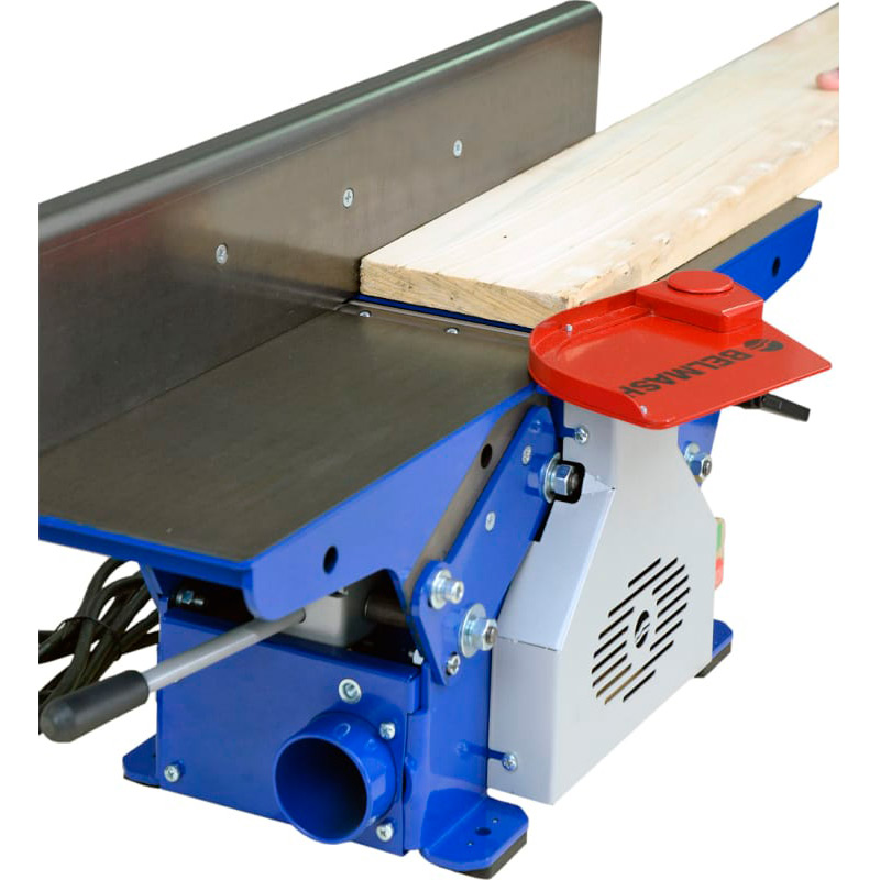 Станок фуговальный BELMASH BJM-750/150T предназначен для обработки древесины фугованием (строганием). При соответствующей наладке можно выполнять следующие виды обработки: фугование (строгание) по пластику или кромкам; фугование (строгание) под углом (по ребрам). Вращение от коллекторного двигателя (режим работы S1) к ножевому валу передается с помощью поликлиноременной передачи. Ремень охватывает ведущий, ведомый шкивы и шкив турбины системы удаления отходов резания. Крыльчатка встроена в корпус станка, а к патрубку (_63мм) присоединяется специальный стружкосборник. Длина рабочей части – 154мм. Диаметр с установленными ножами - 55мм. При фуговании приёмный стол устанавливается на уровне реза ножей, а загрузочный стол имеет возможность опускаться ниже этого уровня, что обеспечивает установку необходимой глубины (до 3мм). Ее настраивают с помощью регулируемой шкалы. Общий размер столов – 750x175мм. Подача ручная. Параллельный упор выполнен из шлифованной листовой стали толщиной 5мм и имеет возможность наклона от 0 до 45 градусов.