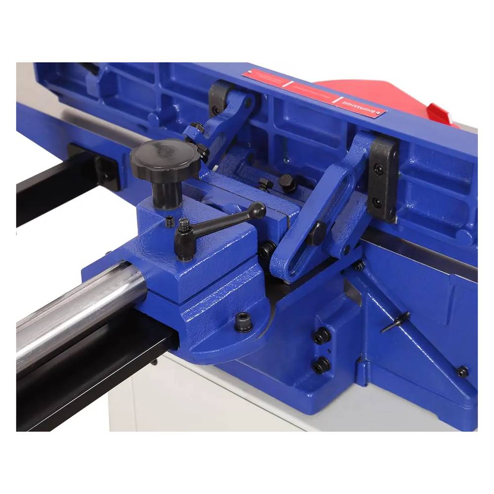 Размер параллельного упора 885x123мм, он позволяет осуществлять строгание под углом 90 и 45 градусов во внешнюю и внутреннюю стороны. Способ перемещения – реечный, более удобный механизм выставления угла.
