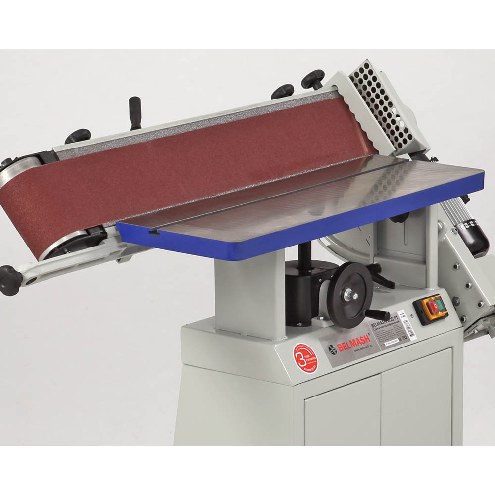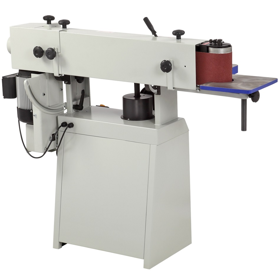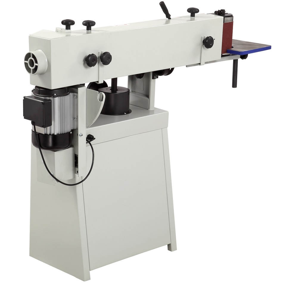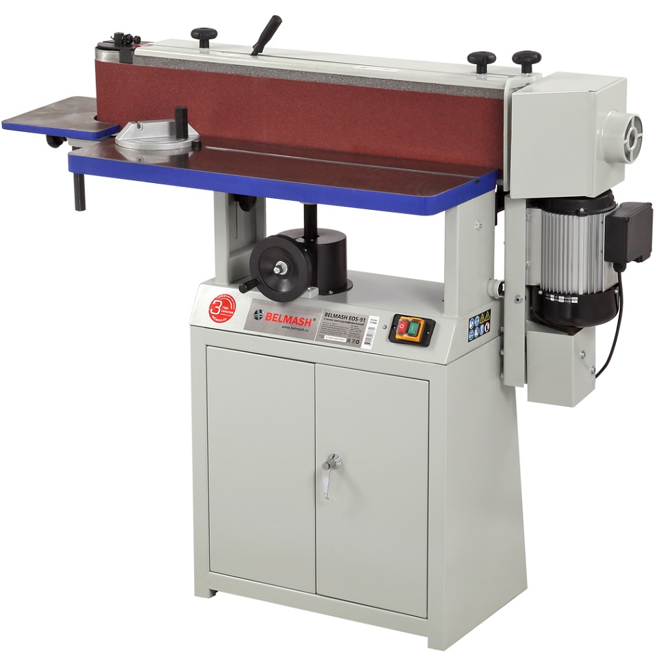 Станок BELMASH EOS-91 предназначен для окончательной обработки абразивным материалом поверхностей заготовок из древесины, древесных материалов и пластика с помощью движущейся шлифовальной ленты. Конструктивно он представляет собой шлифовальный блок с приводом и двумя рабочими столами, размещенными на основании. У ленточного блока предусмотрена регулировка угла наклона от 0 до 90 градусов. Рассчитан на подключение к сети 230 В. В движение ленту приводит однофазный асинхронный двигатель мощностью 2200 Вт. Ее скорость движения 16 м/с. Механизм осцилляции улучшает качество процесса шлифования. Амплитуда колебаний -12,5 мм. Поэтому при ширине ленты 152 мм максимальная высота обработки составляет 160 мм. Рабочие столы выполнены из чугуна и прошли фрезерное шлифование, имеют регулировку по высоте. В паз основного рабочего стола можно установить параллельную направляющую или угловой упор. Поэтому можно обрабатывать не только канты, но и пласть. Назначение малого стола - шлифование заготовок с внутренним радиусом закругления до 55 мм. Система быстрого натяжения позволяет оперативно сменить или отрегулировать ленту, исключить «убегание». Для подключения к вытяжным установкам справа от шлифовального блока предусмотрен специальный кожух с патрубком диаметром 100 мм. Особого внимания заслуживает основание станка. Оно полностью закрыто и имеет распашные дверки в передней части. Внутри установлена полка, что позволяет использовать пространство под станиной для хранения принадлежностей и инструмента.