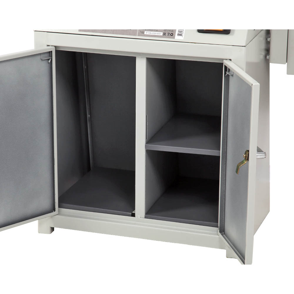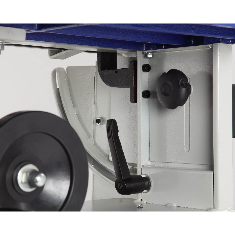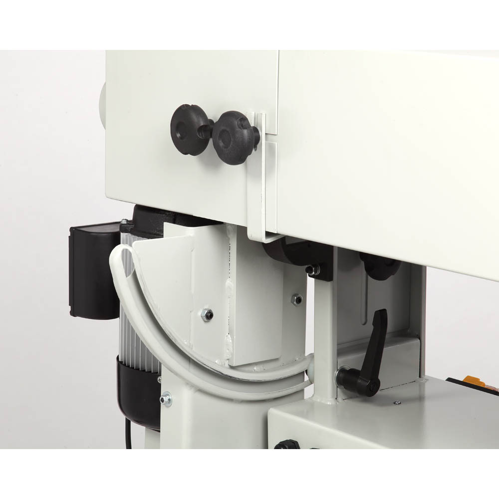 Станок BELMASH EOS-91 предназначен для окончательной обработки абразивным материалом поверхностей заготовок из древесины, древесных материалов и пластика с помощью движущейся шлифовальной ленты. Конструктивно он представляет собой шлифовальный блок с приводом и двумя рабочими столами, размещенными на основании. У ленточного блока предусмотрена регулировка угла наклона от 0 до 90 градусов. Рассчитан на подключение к сети 230 В. В движение ленту приводит однофазный асинхронный двигатель мощностью 2200 Вт. Ее скорость движения 16 м/с. Механизм осцилляции улучшает качество процесса шлифования. Амплитуда колебаний -12,5 мм. Поэтому при ширине ленты 152 мм максимальная высота обработки составляет 160 мм. Рабочие столы выполнены из чугуна и прошли фрезерное шлифование, имеют регулировку по высоте. В паз основного рабочего стола можно установить параллельную направляющую или угловой упор. Поэтому можно обрабатывать не только канты, но и пласть. Назначение малого стола - шлифование заготовок с внутренним радиусом закругления до 55 мм. Система быстрого натяжения позволяет оперативно сменить или отрегулировать ленту, исключить «убегание». Для подключения к вытяжным установкам справа от шлифовального блока предусмотрен специальный кожух с патрубком диаметром 100 мм. Особого внимания заслуживает основание станка. Оно полностью закрыто и имеет распашные дверки в передней части. Внутри установлена полка, что позволяет использовать пространство под станиной для хранения принадлежностей и инструмента.