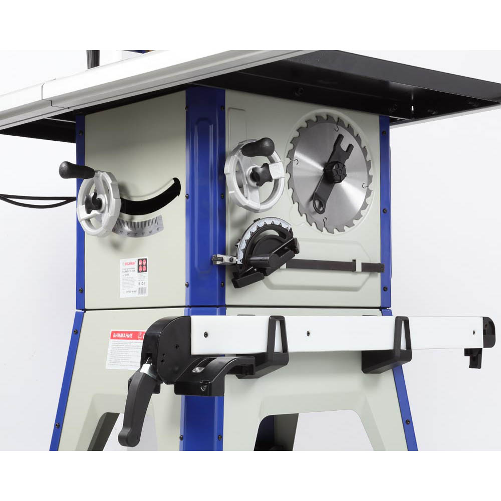 Модель оснащена асинхронным двигателем мощностью 1800 Вт и предназначена для работы с дисками диаметром до 254 мм, с высотой пропила до 80 мм. Работает от сети 380 Вт. Чугунный рабочий стол с двумя дополнительными секциями из стали характеризуется повышенной прочностью поверхности. Стол имеет два стандартных паза для установки углового упора или дополнительных приспособлений. Параллельный упор, выполненный из алюминиевого профиля с накладками из фторопласта, с надежным фиксатором положения на направляющих. Корпус изделия сварной, закрытый, изготовлен из листовой стали, имеет отверстие для установки патрубка для отвода стружки (_ 100 мм), снабжен специальными держателями для хранения толкателя, углового упора, параллельного упора, ключа и пильных дисков. Механизм защиты от отброса заготовки позволяет безопасно распиливать заготовки.