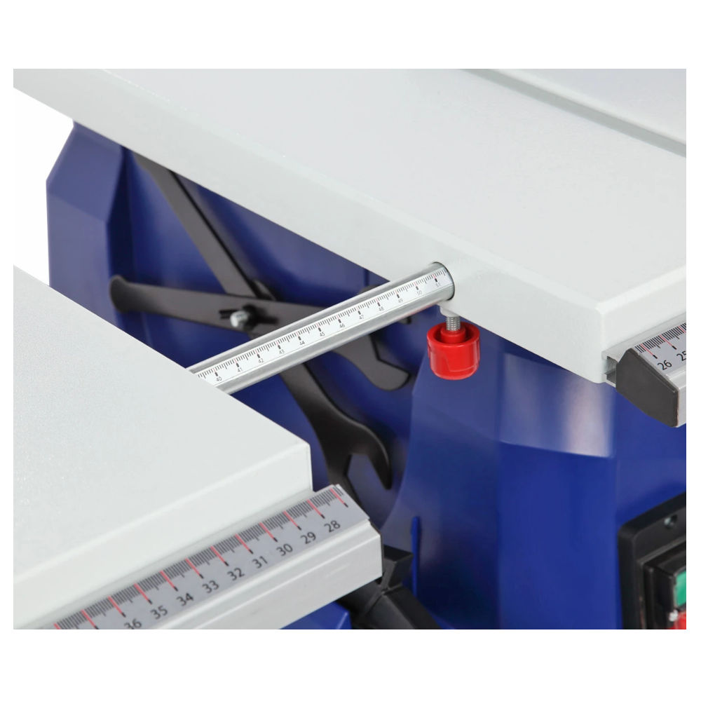 Параллельный упор также можно поставить как справа, так и слева от пильного диска. На передней направляющей параллельного упора есть шкалы для точного позиционирования. Шкалами снабжены и штанги боковых столов. В комплектации этой модели есть дополнительное приспособление - упор для работы с узкими заготовками. он устанавливается как накладка на параллельную направляющую. Корпус изделия закрытый, изготовлен из пластика. Снабжен специальными держателями для упоров, толкателя, ключей и пильного диска.